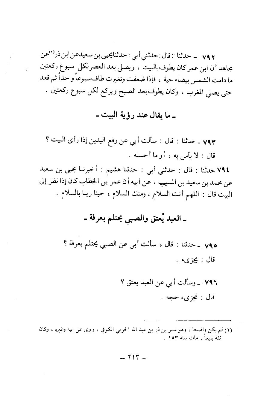 792 - حَدثنَا قَالَ حَدثنِي ابي حَدثنَا يحيى بن سعيد عَن ابْن ذَر عَن مُجَاهِد ان ابْن عمر كَانَ يطوف بِالْبَيْتِ وَيُصلي بعد الْعَصْر لكل سبوع رَكْعَتَيْنِ مَا دَامَت الشَّمْس بَيْضَاء حَيَّة فَإِذا ضعفت وتغيرت طَاف سبوعا وَاحِدًا ثمَّ قعد حَتَّى يُصَلِّي الْمغرب وَكَانَ يطوف بعد الصُّبْح ويركع لكل سبوع رَكْعَتَيْنِ