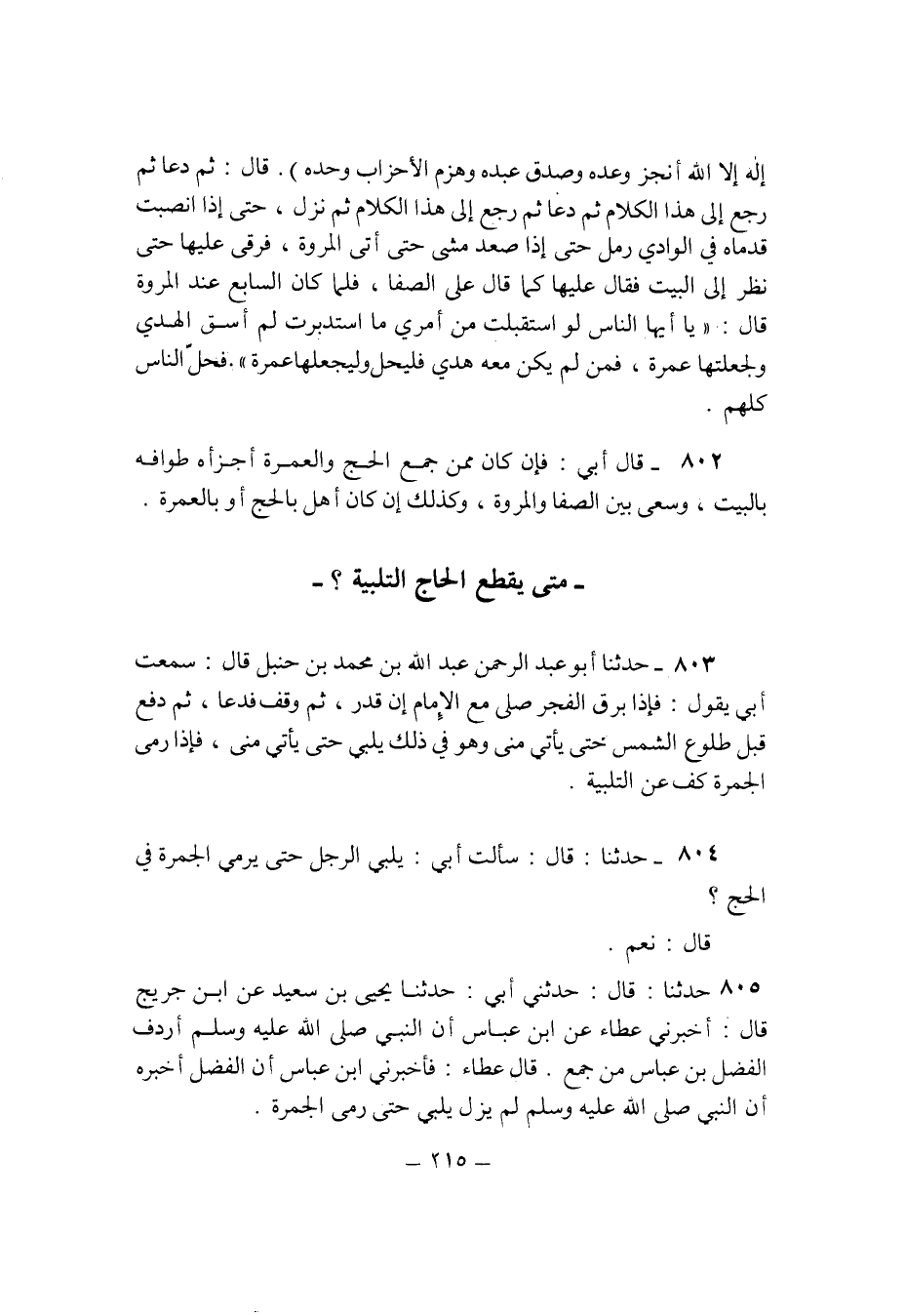 803 - حَدثنَا قَالَ ابو عبد الرَّحْمَن عبد الله بن مُحَمَّد بن حَنْبَل قَالَ سَمِعت ابي يَقُول فَإِذا برق الْفجْر صلى مَعَ الامام ان قدر ثمَّ وقف فَدَعَا ثمَّ دفع قبل طُلُوع الشَّمْس حَتَّى يَأْتِي منى وَهُوَ فِي ذَلِك يُلَبِّي حَتَّى يَأْتِي مني فَإِذا رمى الْجَمْرَة كف عَن التَّلْبِيَة