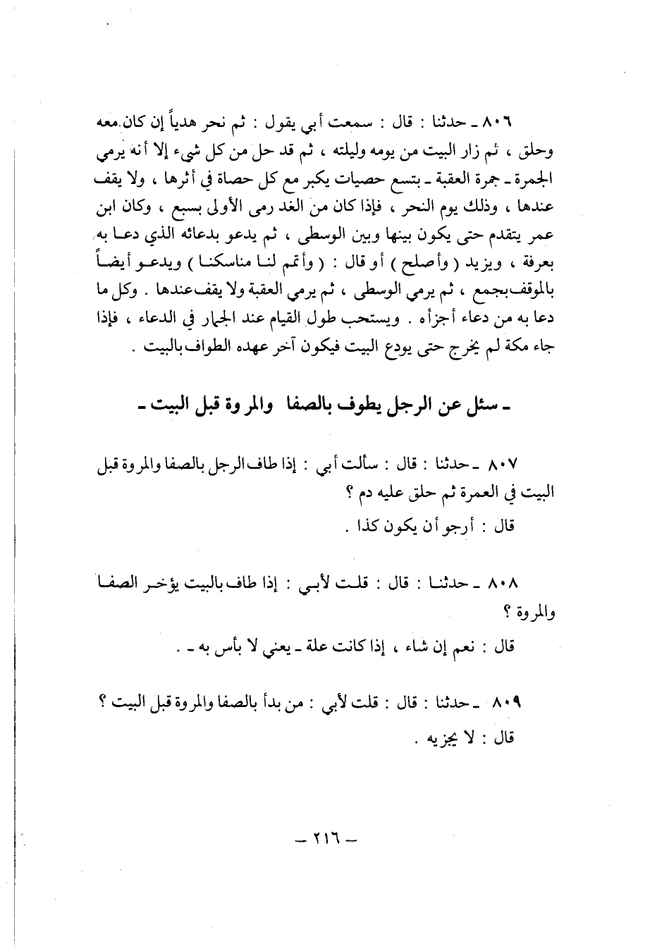 806 - حَدثنَا قَالَ سَمِعت ابي يَقُول ثمَّ نحر هَديا ان كَانَ مَعَه وَحلق ثمَّ زار الْبَيْت من يَوْمه وَلَيْلَته ثمَّ قد حل من كل شَيْء الا انه يَرْمِي الْجَمْرَة جَمْرَة الْعقبَة بتسع حَصَيَات يكبر مَعَ كل حَصَاة فِي أَثَرهَا وَلَا يقف عِنْدهَا وَذَلِكَ يَوْم النَّحْر فَإِذا كَانَ من الْغَد رمى الأولى بِسبع وَكَانَ ابْن عمر يتَقَدَّم حَتَّى يكون بَينهَا وَبَين الْوُسْطَى ثمَّ يَدْعُو بدعائه الَّذِي دَعَا بِهِ بِعَرَفَة وَيزِيد واصلح اَوْ قَالَ واتمم لنا مناسكنا وَيَدْعُو ايضا بالموقف بِجمع ثمَّ يَرْمِي الْوُسْطَى ثمَّ يَرْمِي الْعقبَة وَلَا يقف عِنْدهَا وكل من دَعَا بِهِ من دُعَاء أَجزَأَهُ وَيسْتَحب طول الْقيام عِنْد الْجمار فِي الدُّعَاء فَإِذا جَاءَ مَكَّة لم يخرج حَتَّى يودع الْبَيْت فَيكون آخر عَهده الطّواف بِالْبَيْتِ