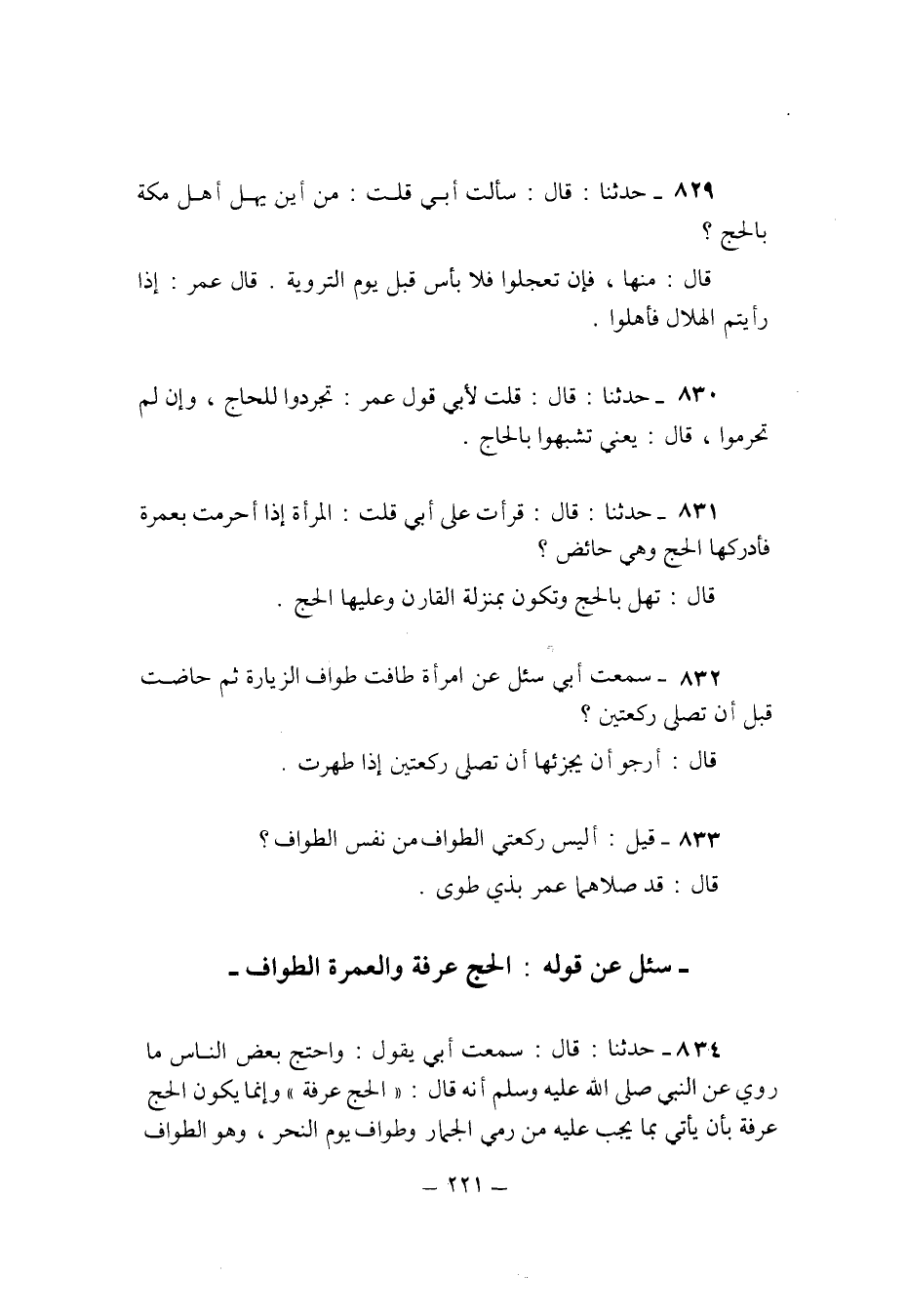 834 - حَدثنَا قَالَ سَمِعت ابي يَقُول وَاحْتج بعض النَّاس مَا رُوِيَ عَن النَّبِي صلى الله عَلَيْهِ وَسلم انه قَالَ الْحَج عَرَفَة وانما يكون الْحَج عَرَفَة بِأَن يَأْتِي بِمَا يجب عَلَيْهِ من رمي الْجمار وَطواف يَوْم النَّحْر وَهُوَ الطّواف