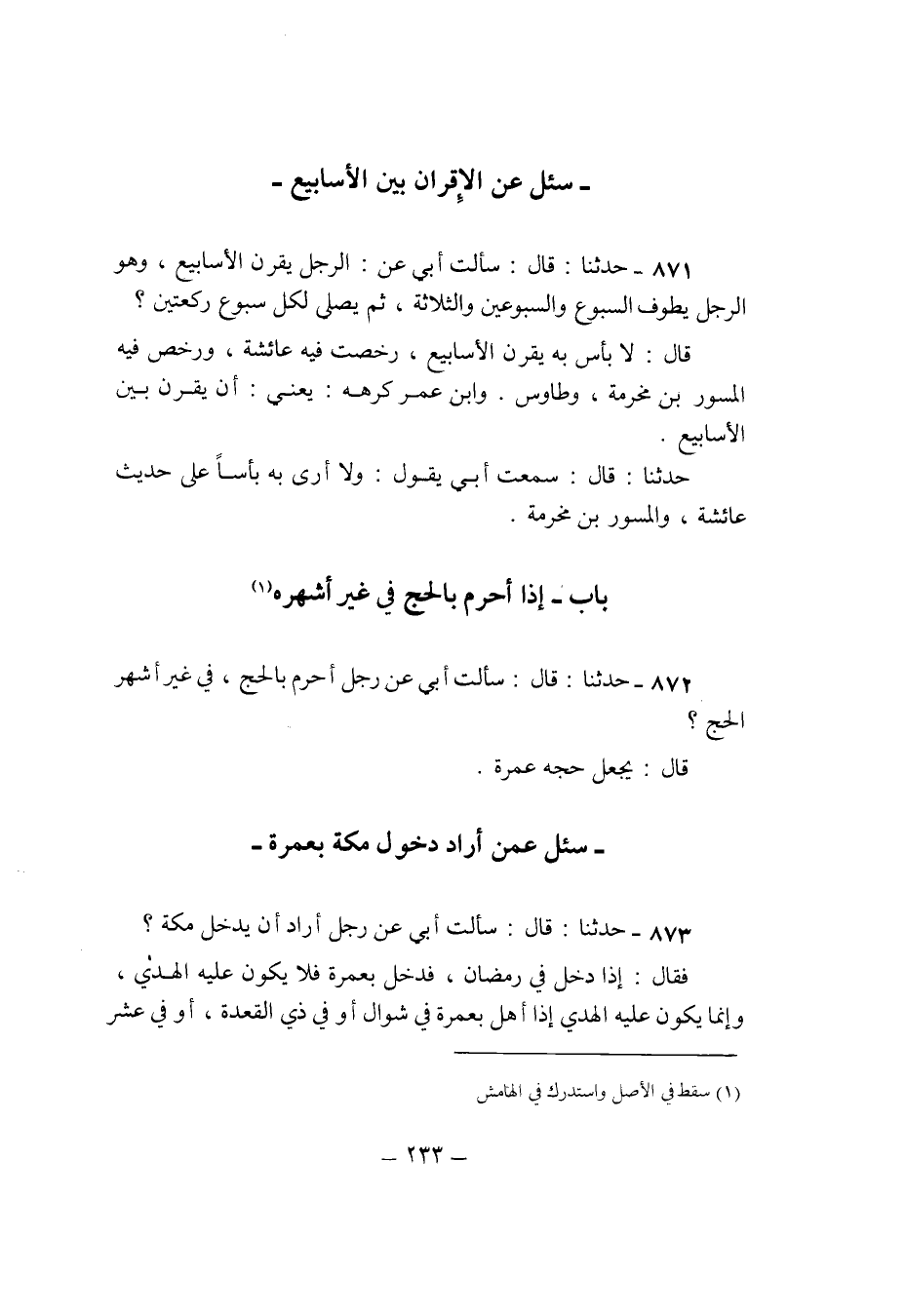 871 - حَدثنَا قَالَ سَأَلت ابي عَن الرجل يقرن الاسابيع وَهُوَ الرجل يطوف السبوع والسبوعين وَالثَّلَاثَة ثمَّ يُصَلِّي لكل سبوع رَكْعَتَيْنِ