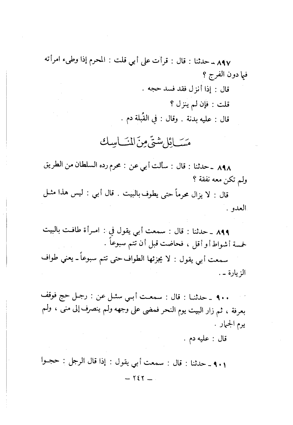 897 - حَدثنَا قَالَ قَرَأت على ابي قلت الْمحرم اذا وطئ امْرَأَته فِيمَا دون الْفرج