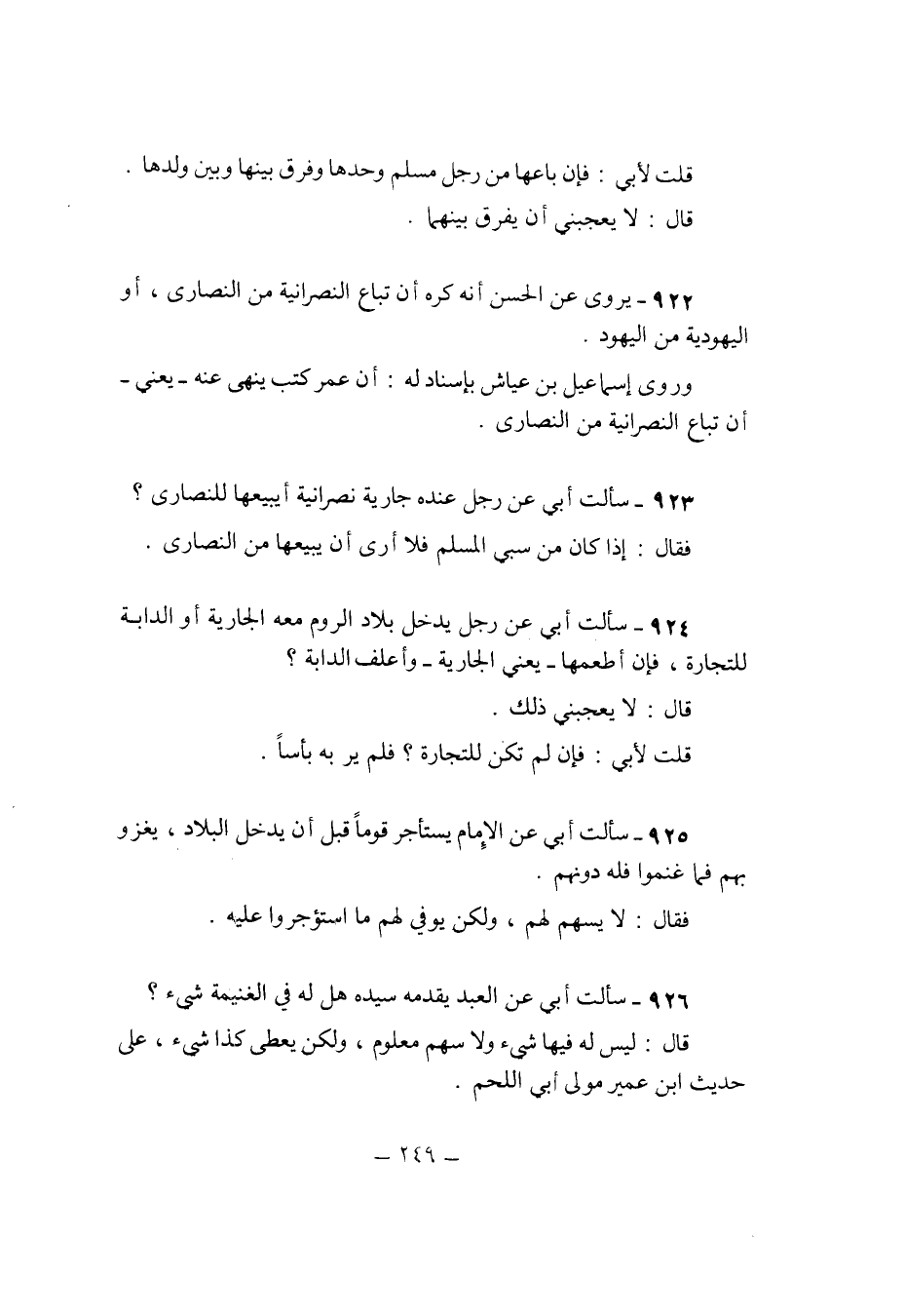 923 - سَأَلت ابي عَن رجل عِنْده جَارِيَة نَصْرَانِيَّة أيبيعها لِلنَّصَارَى