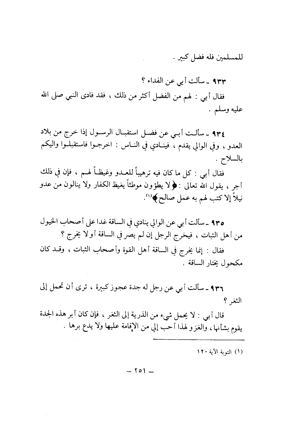 935 - سَأَلت أبي عَن الْوَالِي يُنَادي فِي السَّاقَة غَدا على اصحاب الْخُيُول من أهل الثَّبَات فَيخرج الرجل إِن لم يصر فِي السَّاقَة اَوْ لَا يخرج