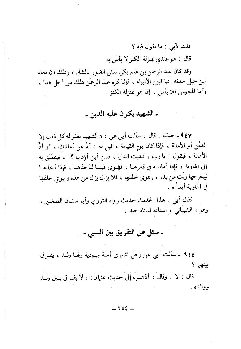 - حَدثنَا قَالَ سَأَلت ابي عَن الشَّهِيد يغْفر لَهُ كل ذَنْب إِلَّا الدّين اَوْ الامانة فَإِذا كَانَ يَوْم الْقِيَامَة قيل لَهُ اد عَن أمانتك اَوْ اد الامانة فَيَقُول يَا رب ذهبت الدُّنْيَا فَمن ايْنَ اؤديها فَينْطَلق بِهِ الى الهاوية فَإِذا امانته فِي قعرها فهوى فِيهَا ليأخذها فَإِذا اخذها ليخرجها زلت من يَده وَهُوَ خلفهَا فَلَا يزَال يزل من هَذِه ويهوي خلفهَا فِي الهاوية ابدا