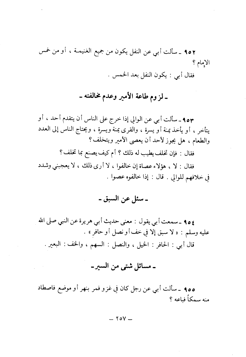 953 - سَأَلت أبي عَن الْوَالِي إِذا خرج على النَّاس أَن يتَقَدَّم أحد أَو يتَأَخَّر أَو يَأْخُذ يمنة أَو يسرة والقرى يمنة ويسرة وَيحْتَاج النَّاس إِلَى الْعدَد وَالطَّعَام هَل يجوز لأحد أَن يعْصى الْأَمِير ويتخلف