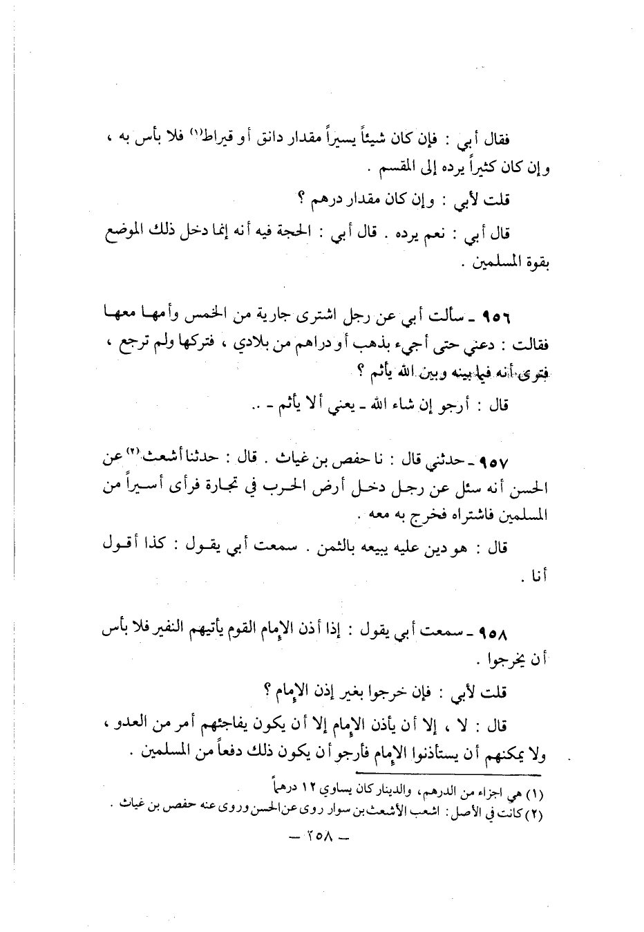 957 - حَدثنِي قَالَ نَا حَفْص بن غياث قَالَ حَدثنَا اشعث عَن الْحسن أَنه سُئِلَ عَن رجل دخل أَرض الْحَرْب فِي تِجَارَة فَرَأى أَسِيرًا من الْمُسلمين فَاشْتَرَاهُ فَخرج بِهِ مَعَه