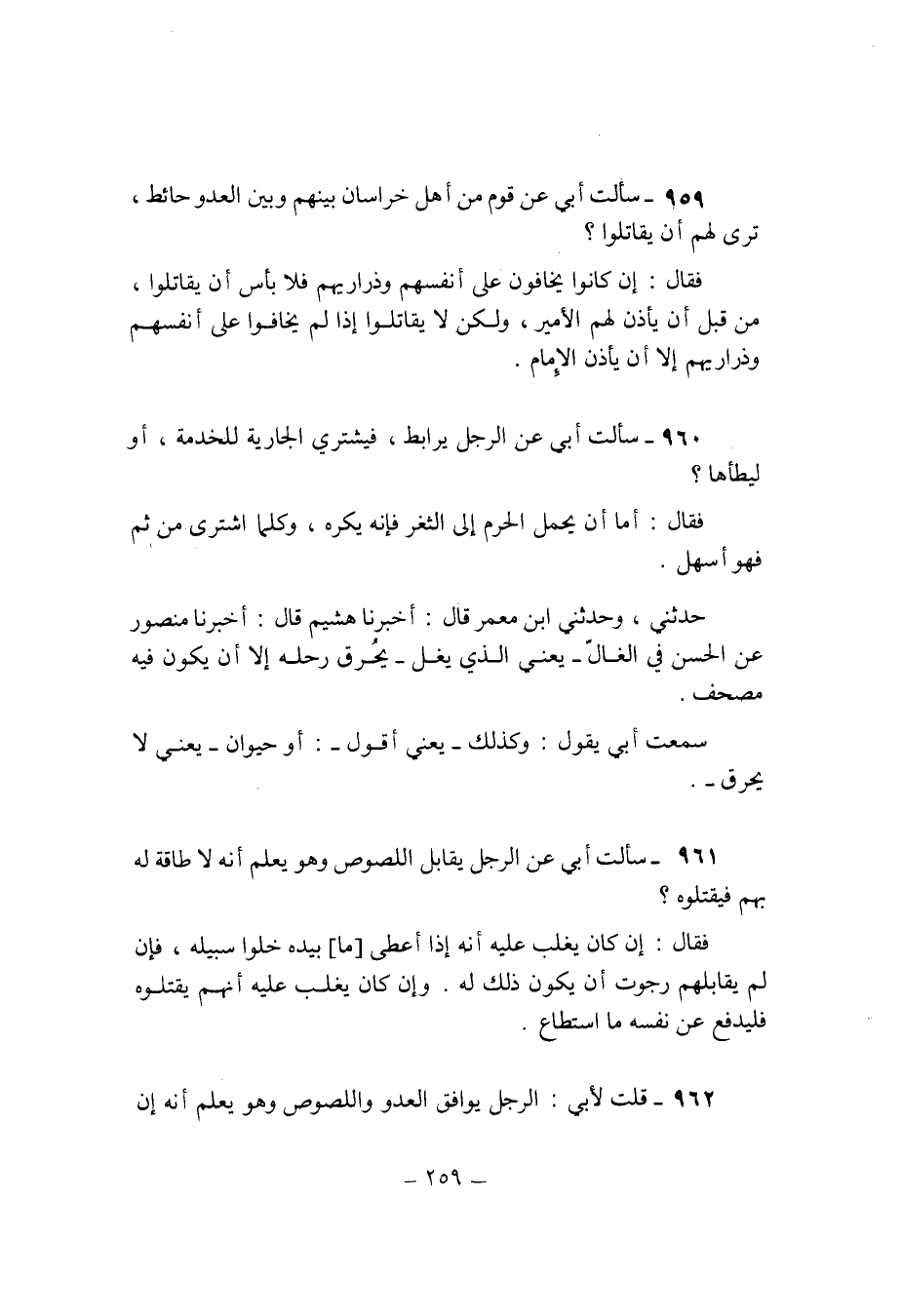 961 - سَأَلت أبي عَن الرجل يُقَابل اللُّصُوص وَهُوَ يعلم انه لَا طَاقَة لَهُ بهم فيقتلوه