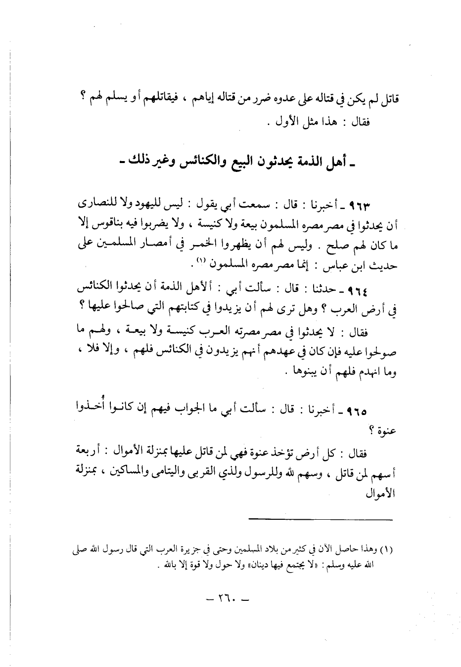964 - حَدثنَا قَالَ سَأَلت أبي الْأَهْل الذِّمَّة أَن يحدثوا الْكَنَائِس فِي ارْض الْعَرَب وَهل ترى لَهُم أَن يزِيدُوا فِي كتابتهم الَّتِي صَالحُوا عَلَيْهَا
