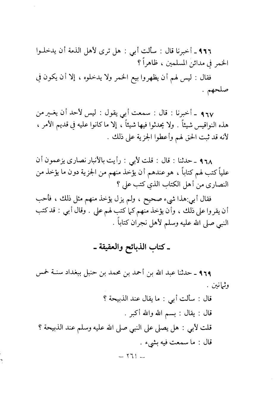 966 - اُخْبُرْنَا قَالَ سَأَلت ابي هَل ترى لأهل الذِّمَّة أَن يدخلُوا الْخمر فِي مَدَائِن الْمُسلمين ظَاهرا