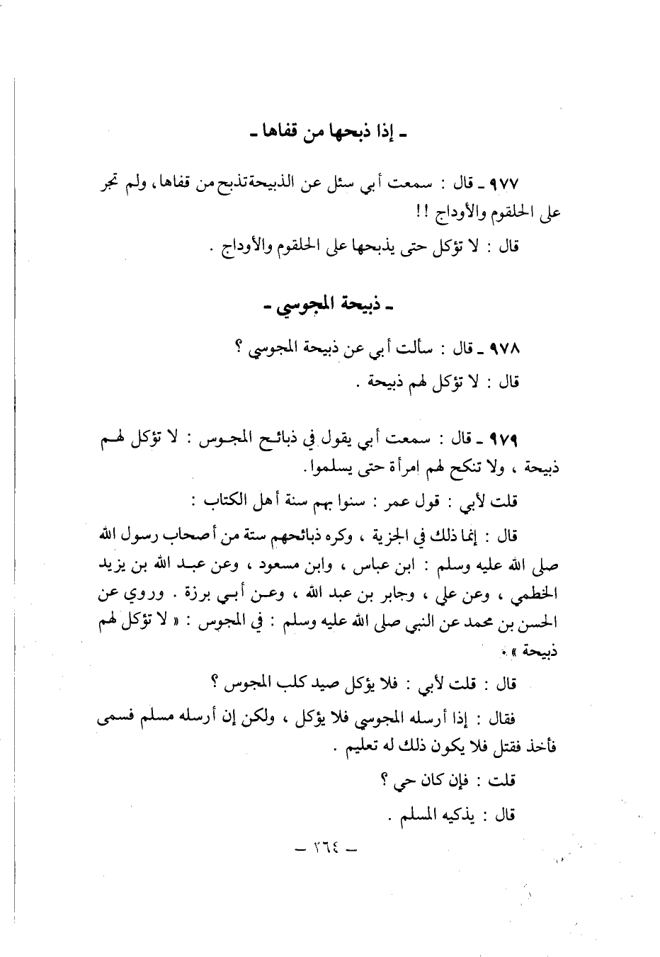 979 - قَالَ سَمِعت ابي يَقُول فِي ذَبَائِح الْمَجُوس لَا تُؤْكَل لَهُم ذَبِيحَة وَلَا تنْكح لَهُم امْرَأَة حَتَّى يسلمُوا