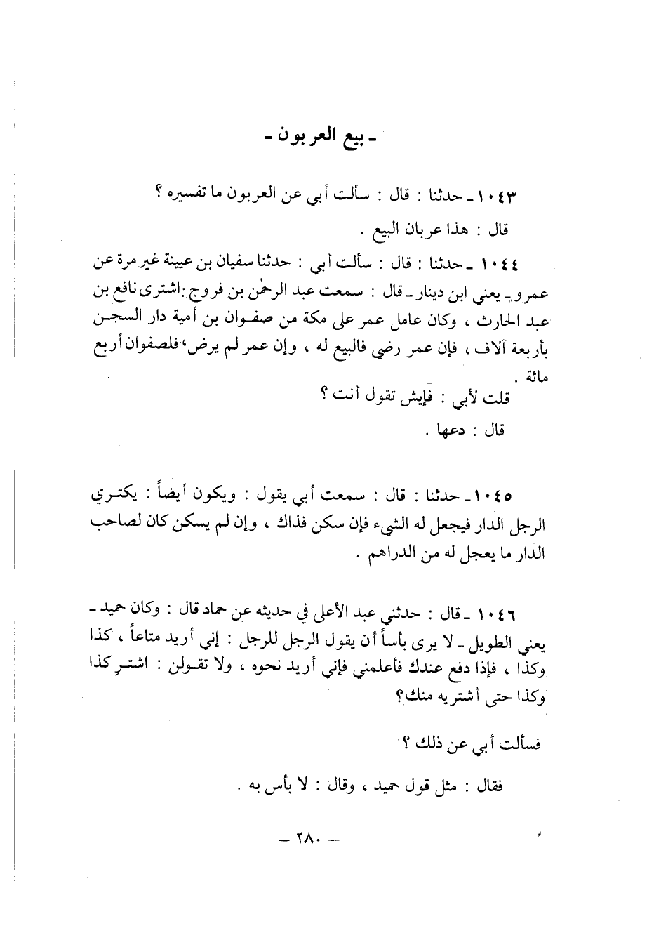 1044 - حَدثنَا قَالَ سَأَلت ابي حَدثنَا سُفْيَان بن عُيَيْنَة غير مرّة عَن عَمْرو يَعْنِي ابْن دِينَار قَالَ سَمِعت عبد الرَّحْمَن بن فروج اشْترى نَافِع بن عبد الْحَارِث وَكَانَ عَامل عمر على مَكَّة من صَفْوَان بن امية دَار السجْن بأَرْبعَة آلَاف فَإِن عمر رَضِي فَالْبيع لَهُ وان عمر لم يرض فلصفوان ارْبَعْ مائَة