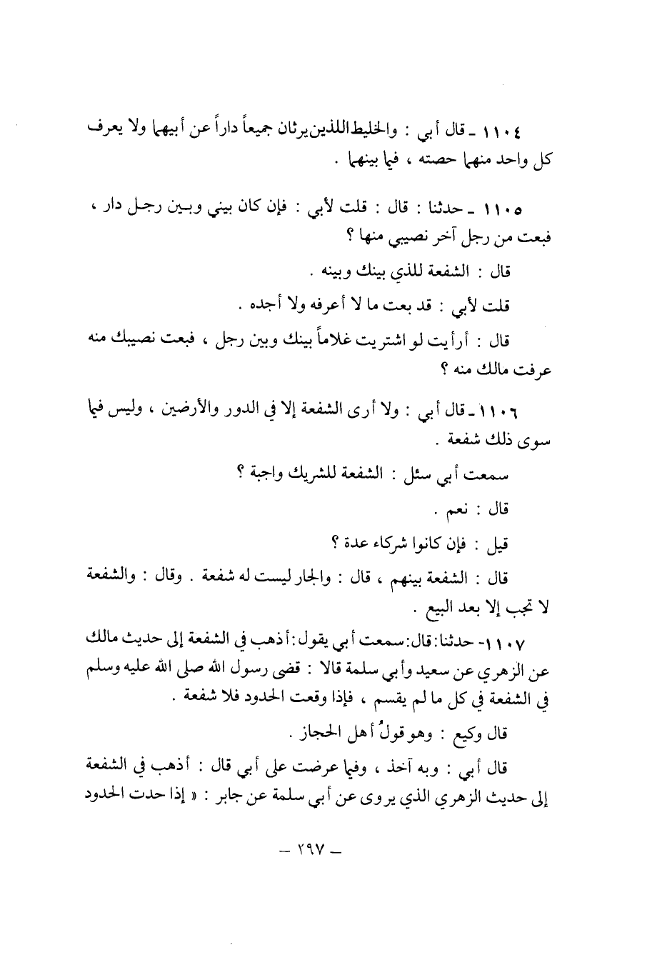 1106 - قَالَ ابي وَلَا أرى الشُّفْعَة الى فِي الدّور والارضين وَلَيْسَ فِيمَا سوى ذَلِك شُفْعَة