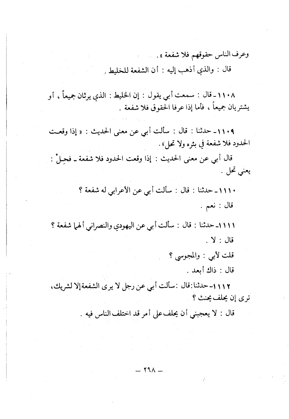 1108 - قَالَ سَمِعت ابي يَقُول إِن الخليط الَّذِي يرثان جَمِيعًا أَو يشتريان جَمِيعًا فَأَما إِذا عرفا الْحُقُوق فَلَا شُفْعَة