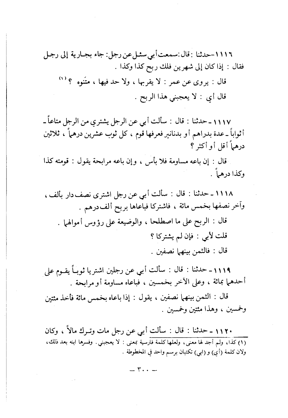 1119 - حَدثنَا قَالَ سَأَلت ابي عَن رجلَيْنِ اشتريا ثوبا يقوم على احدهما بِمِائَة وعَلى الآخر بِخَمْسِينَ فباعاه مساومة اَوْ مُرَابحَة