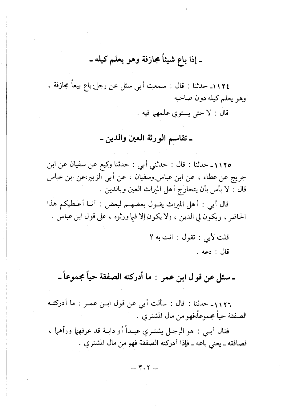 1125 - حَدثنَا قَالَ حَدثنِي ابي حَدثنَا وَكِيع عَن سُفْيَان عَن ابْن جريج عَن عَطاء عَن ابْن عَبَّاس وسُفْيَان عَن ابي الزبير عَن ابْن عَبَّاس قَالَ لَا بَأْس بِأَن يتخارج اهل الْمِيرَاث الْعين وبالدين