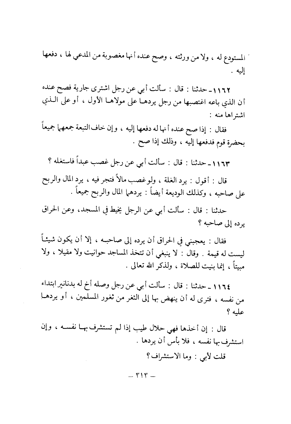 1162 - حَدثنَا قَالَ سَأَلت أبي عَن رجل اشْترى جَارِيَة فصح عِنْده أَن الَّذِي بَاعه اغتصبها من رجل يردهَا على مَوْلَاهَا الاول اَوْ على الَّذِي اشْتَرَاهَا مِنْهُ