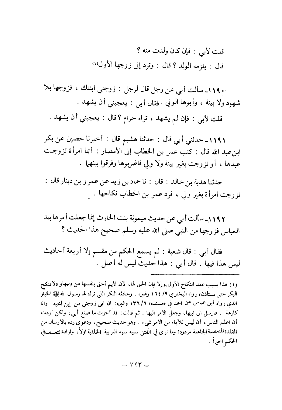 1190 - سَأَلت ابي عَن رجل قَالَ لرجل زَوجنِي ابْنَتك فَزَوجهَا بِلَا شُهُود وَلَا بَيِّنَة وأبوها الْوَلِيّ فَقَالَ ابي يُعجبنِي أَن يشْهد