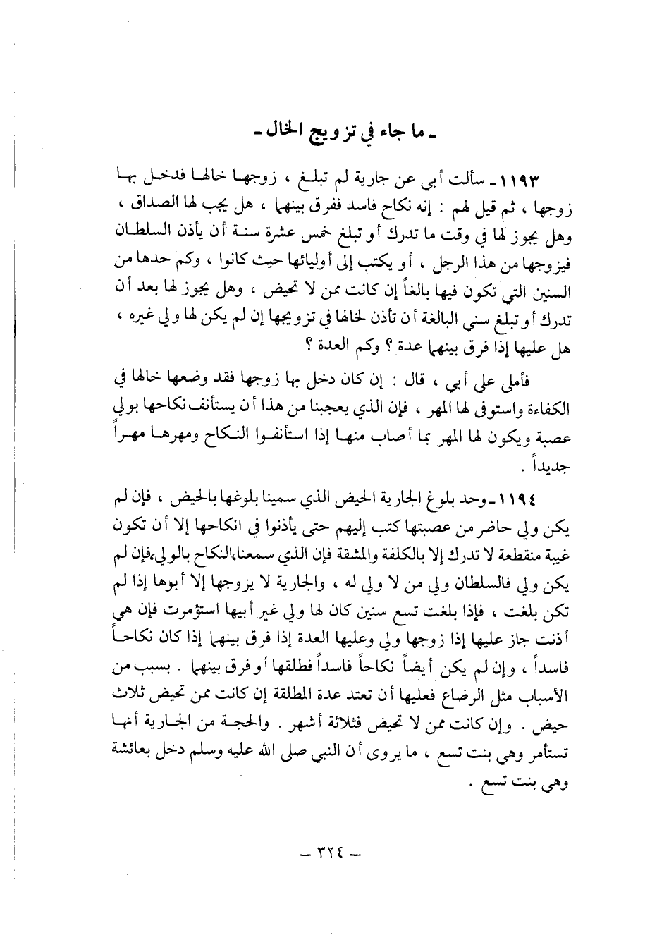 1194 - وحد بُلُوغ الْجَارِيَة الْحيض الَّذِي سمينا بُلُوغهَا بِالْحيضِ فَإِن لم يكن ولي حَاضر من عصبتها كتب إِلَيْهِم حَتَّى يأذنوا فِي انكاحها إِلَّا أَن تكون غيبَة مُنْقَطِعَة لَا تدْرك إِلَّا بالكلفة وَالْمَشَقَّة فَإِن الَّذِي سمعنَا النِّكَاح بالولي فَإِن لم يكن ولي فالسلطان ولي من لَا ولي لَهُ وَالْجَارِيَة لَا يُزَوّجهَا إِلَّا أَبوهَا إِذا لم تكن بلغت فَإِذا بلغت تسع سِنِين كَانَ لَهَا ولي غير أَبِيهَا استؤمرت فَإِن هِيَ أَذِنت جَازَ عَلَيْهَا اذا زَوجهَا ولي وَعَلَيْهَا الْعدة اذا فرق بَينهمَا اذا كَانَ نِكَاحا فَاسِدا وان لم يكن أَيْضا نِكَاحا فَاسِدا فَطلقهَا اَوْ فرق بَينهمَا بِسَبَب من الْأَسْبَاب مثل الرَّضَاع فعلَيْهَا أَن تَعْتَد عدَّة الْمُطلقَة إِن كَانَت مِمَّن تحيض ثَلَاث حيض وان كَانَت مِمَّن لَا تحيض فَثَلَاثَة اشهر وَالْحجّة من الْجَارِيَة انها تستأمر وَهِي بنت تسع مَا يرْوى أَن النَّبِي صلى الله عَلَيْهِ وَسلم دخل بعائشة وَهِي بنت تسع