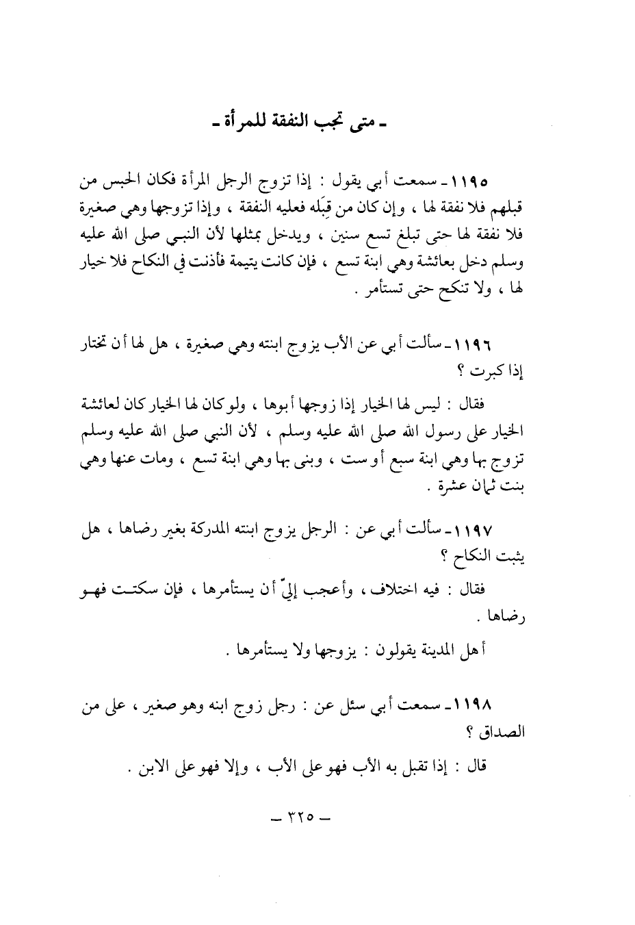 1195 - سَمِعت ابي يَقُول اذا تزوج الرجل الْمَرْأَة فَكَانَ الْحَبْس من قبلهم فَلَا نَفَقَة لَهَا وان كَانَ من قبله فَعَلَيهِ النَّفَقَة واذا تزَوجهَا وَهِي صَغِيرَة فَلَا نَفَقَة لَهَا حَتَّى تبلغ تسع سِنِين وَيدخل بِمِثْلِهَا لِأَن النَّبِي صلى الله عَلَيْهِ وَسلم دخل بعائشة وَهِي ابْنة سبع فَإِن كَانَت يتيمة فَأَذنت فِي النِّكَاح فَلَا خِيَار لَهَا وَلَا تنْكح حَتَّى تستأمر