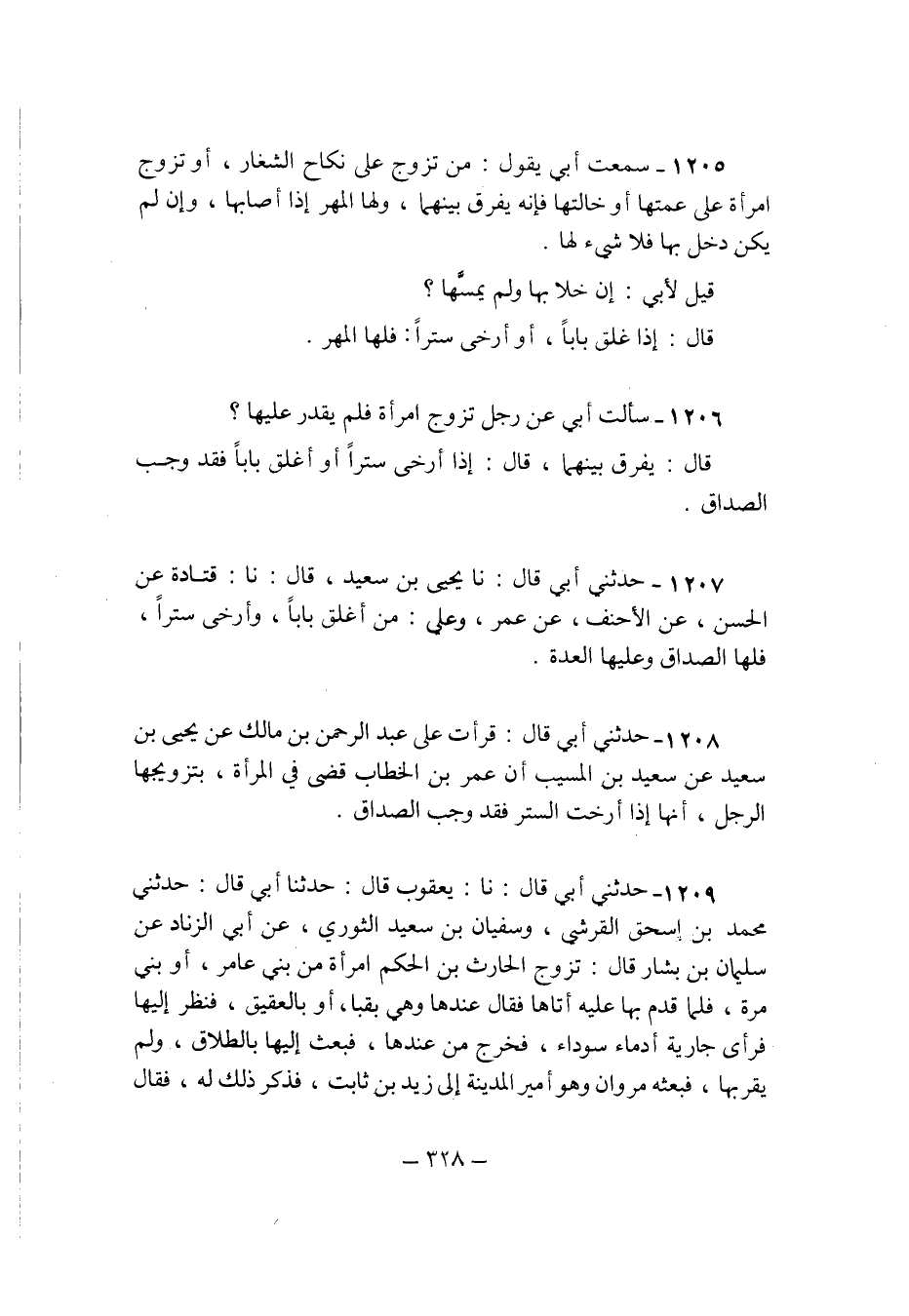1209 - حَدثنِي ابي قَالَ نَا يَعْقُوب قَالَ حَدثنَا ابي قَالَ حَدثنِي مُحَمَّد بن اسحق الْقرشِي وسُفْيَان بن سعيد الثَّوْريّ عَن ابي الزِّنَاد عَن سُلَيْمَان بن بشار قَالَ تزوج الْحَارِث بن الحكم امْرَأَة من بني عَامر اَوْ بني مرّة فَلَمَّا قدم بهَا عَلَيْهِ أَتَاهَا فَقَالَ عِنْدهَا وَهِي بقبا اَوْ بالعقيق فَنظر اليها فَرَأى جَارِيَة ادماء سَوْدَاء فَخرج من عِنْدهَا فَبعث إِلَيْهَا بِالطَّلَاق وَلم يقربهَا فَبَعثه مَرْوَان وَهُوَ امير الْمَدِينَة الى زيد بن ثَابت فَذكر ذَلِك لَهُ فَقَالَ