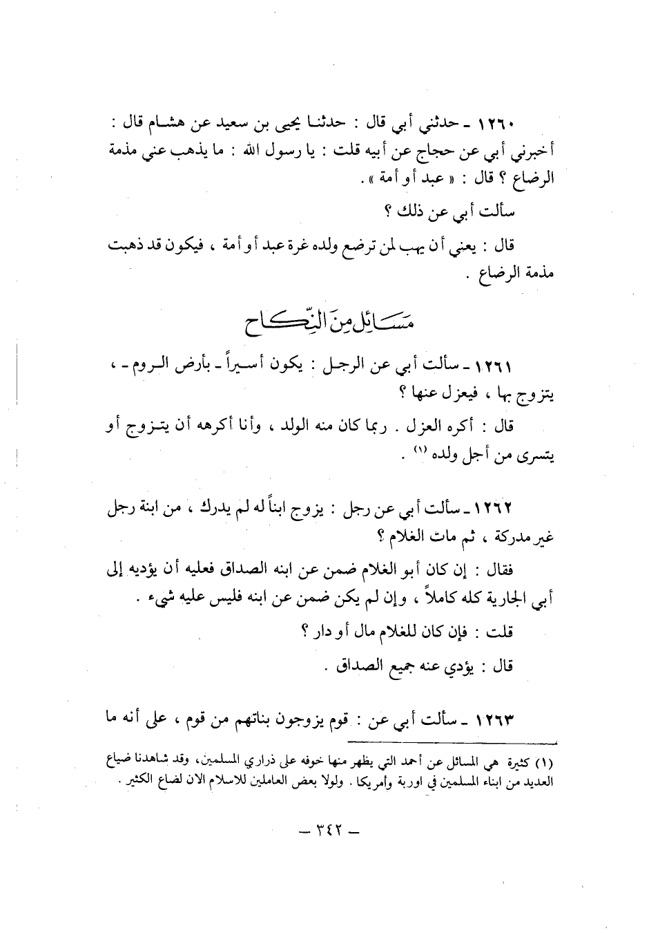 - سَأَلت أبي عَن الرجل يكون أَسِيرًا بِأَرْض الرّوم يتَزَوَّج بهَا فيعزل عَنْهَا