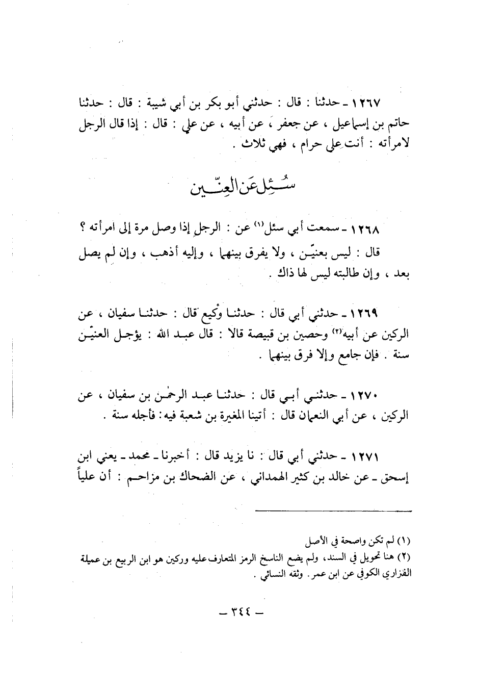 1269 - حَدثنِي ابي قَالَ حَدثنَا وَكِيع قَالَ حَدثنَا سُفْيَان عَن الركين عَن ابيه وحصين بن قبيصَة قَالَا قَالَ عبد الله يُؤَجل الْعنين سنة فَإِن جَامع والا فرق بَينهمَا