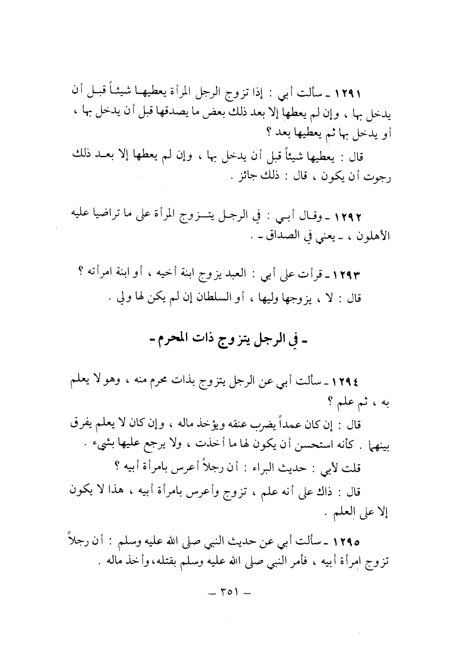 1295 - سَأَلت ابي عَن حَدِيث النَّبِي صلى الله عَلَيْهِ وَسلم ان رجلا تزوج امْرَأَة ابيه فَأمر النَّبِي صلى الله عَلَيْهِ وَسلم بقتْله واخذ مَاله