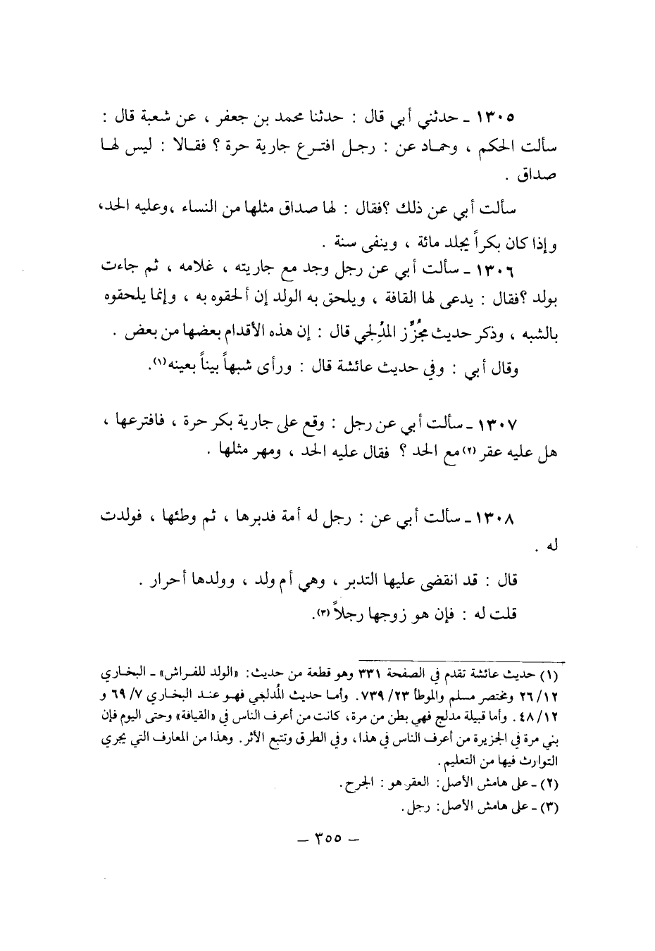 1306 - سَأَلت ابي عَن رجل وجد مَعَ جَارِيَته غُلَامه ثمَّ جَاءَت بِولد فَقَالَ يدعى لَهَا الْقَافة وَيلْحق بِهِ الْوَلَد ان الحقوه بِهِ وَإِنَّمَا يلحقوه بالشبه وَذكر حَدِيث مجزز المدلجي قَالَ ان هَذِه الاقدام بَعْضهَا من بعض
