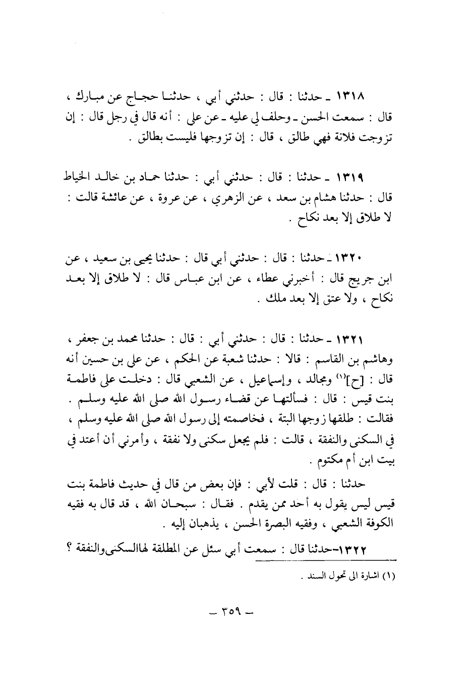 1319 - حَدثنَا قَالَ حَدثنِي ابي حَدثنَا حَمَّاد بن خَالِد الْخياط قَالَ حَدثنَا هِشَام بن سعد عَن الزُّهْرِيّ عَن عُرْوَة عَن عَائِشَة قَالَت لَا طَلَاق الا بعد نِكَاح