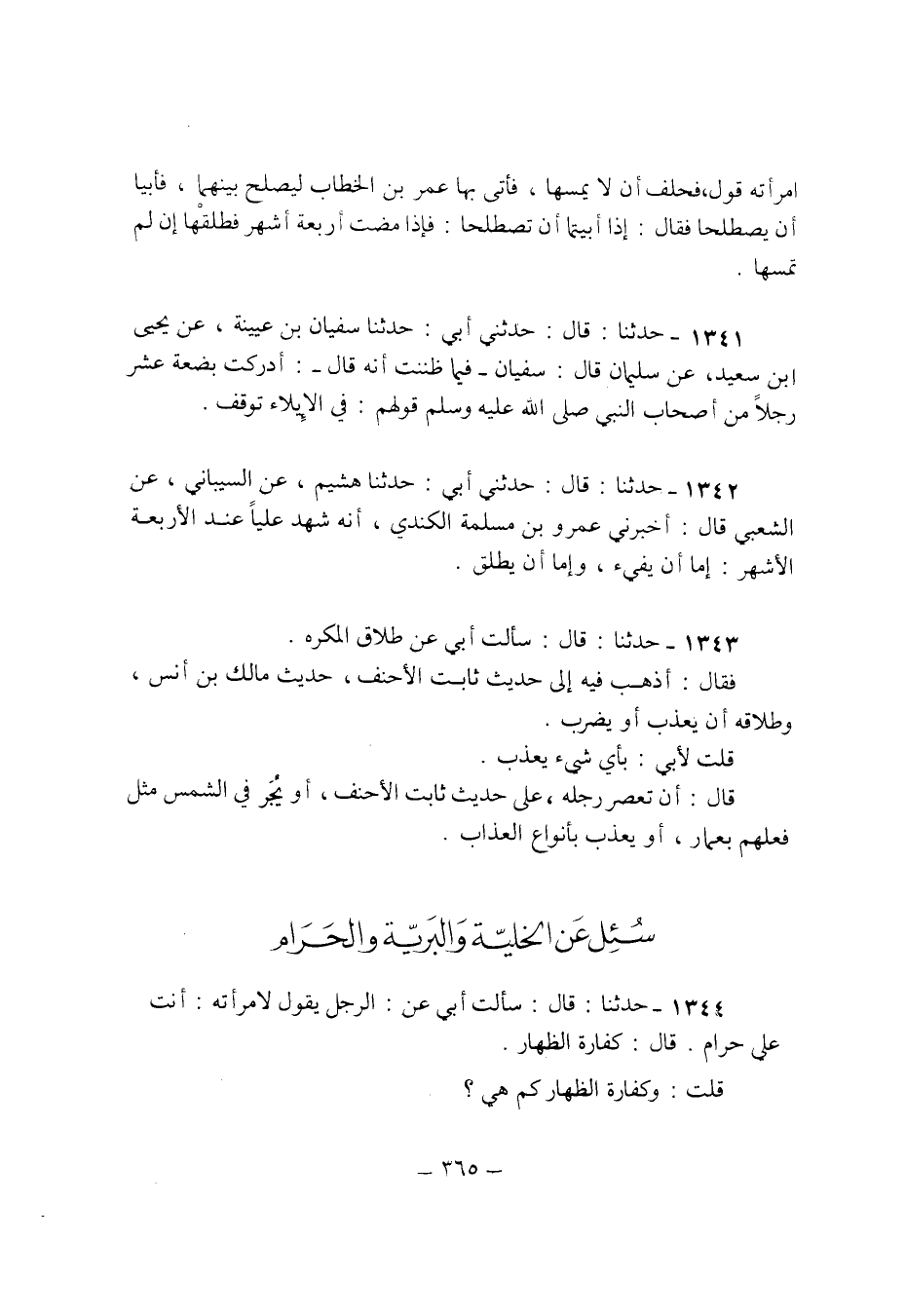 1341 - حَدثنَا قَالَ حَدثنِي ابي حَدثنَا سُفْيَان بن عُيَيْنَة عَن يحيى ابْن سعيد عَن سُلَيْمَان قَالَ سُفْيَان فِيمَا ظَنَنْت انه قَالَ ادركت بضعَة عشر رجلا من اصحاب النَّبِي صلى الله عَلَيْهِ وَسلم قَوْلهم فِي الايلاء توقف