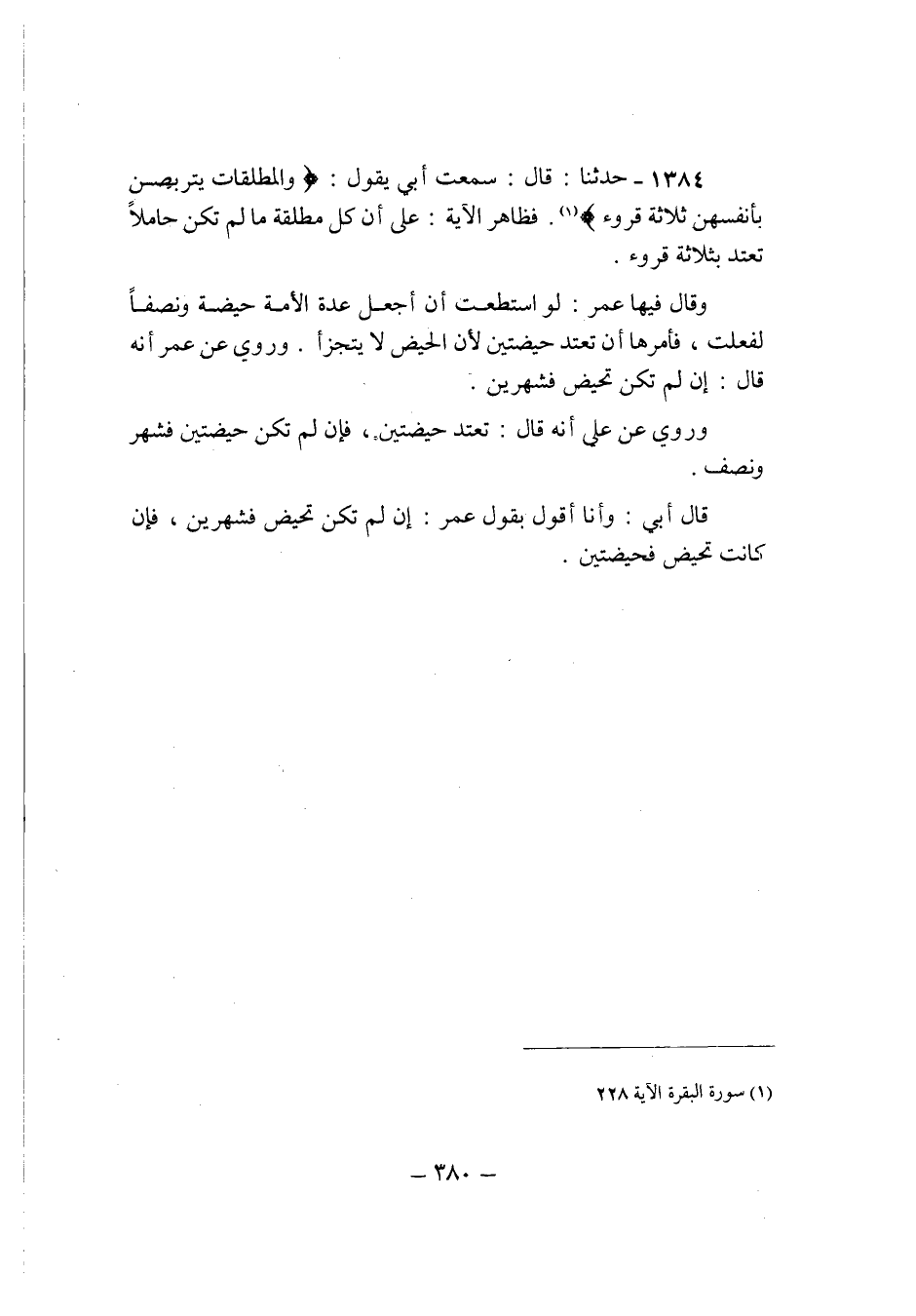 1384 - حَدثنَا قَالَ سَمِعت ابي يَقُول {والمطلقات يَتَرَبَّصْنَ بِأَنْفُسِهِنَّ ثَلَاثَة قُرُوء} فَظَاهر الْآيَة على أَن كل مُطلقَة مَا لم تكن حَامِلا تَعْتَد بِثَلَاثَة قُرُوء