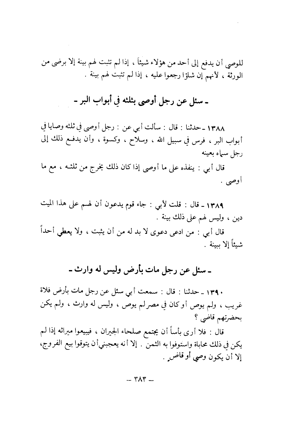 1388 - حَدثنَا قَالَ سَأَلت ابي عَن رجل اوصى فِي ثلثه وَصَايَا فِي ابواب الْبر فرس فِي سَبِيل الله وَسلَاح وَكِسْوَة وان يدْفع ذَلِك الى رجل سَمَّاهُ بِعَيْنِه