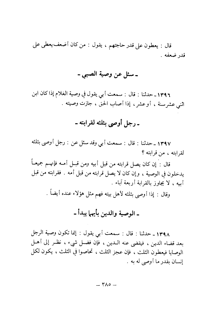 1397 - حَدثنَا قَالَ سَمِعت ابي وَقد سُئِلَ عَن رجل اوصى بِثُلثِهِ لِقَرَابَتِهِ من قرَابَته