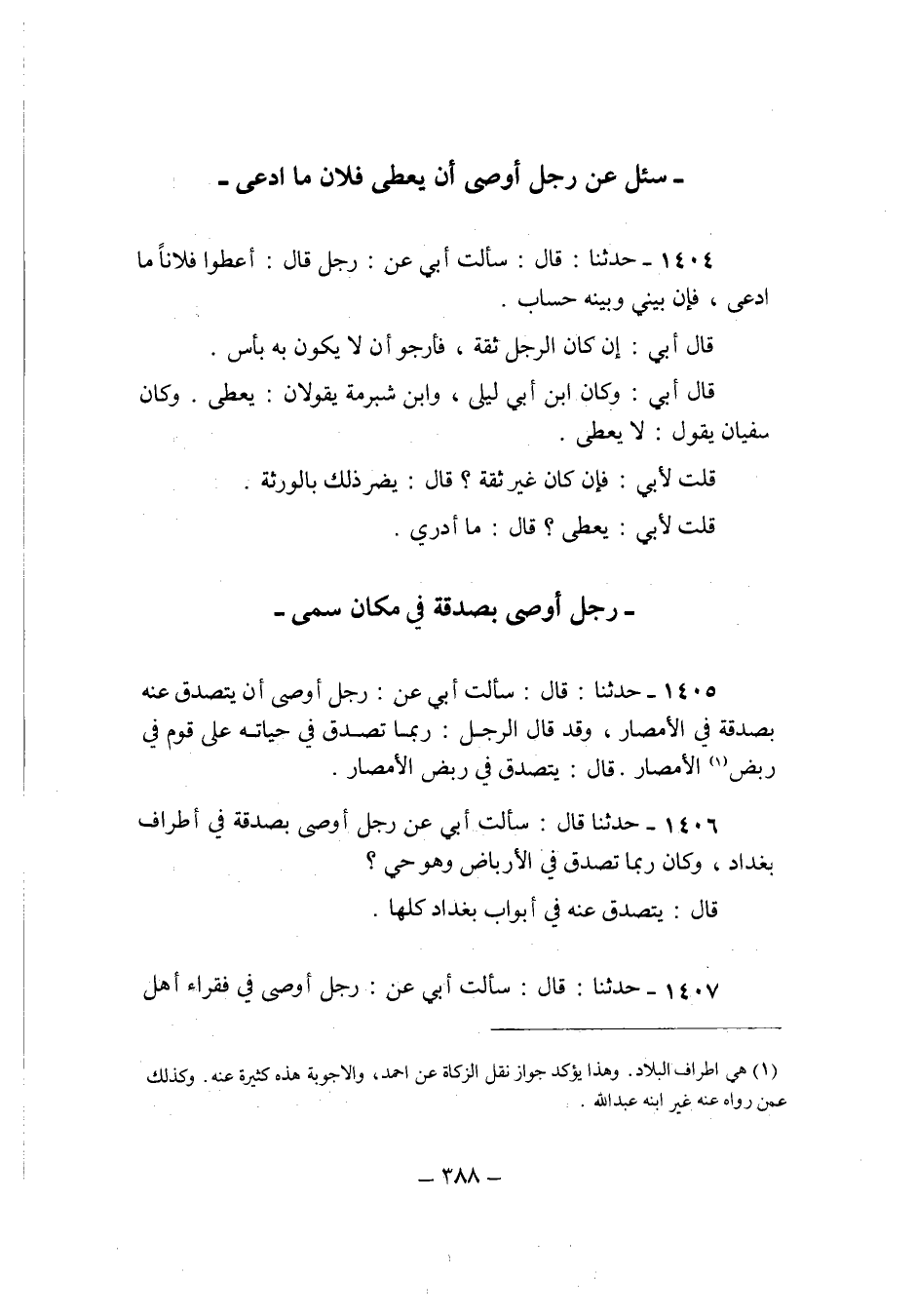 1406 - حَدثنَا قَالَ سَأَلت ابي عَن رجل اوصى بِصَدقَة فِي اطراف بَغْدَاد وَكَانَ رُبمَا تصدق فِي الارباص وَهُوَ حَيّ