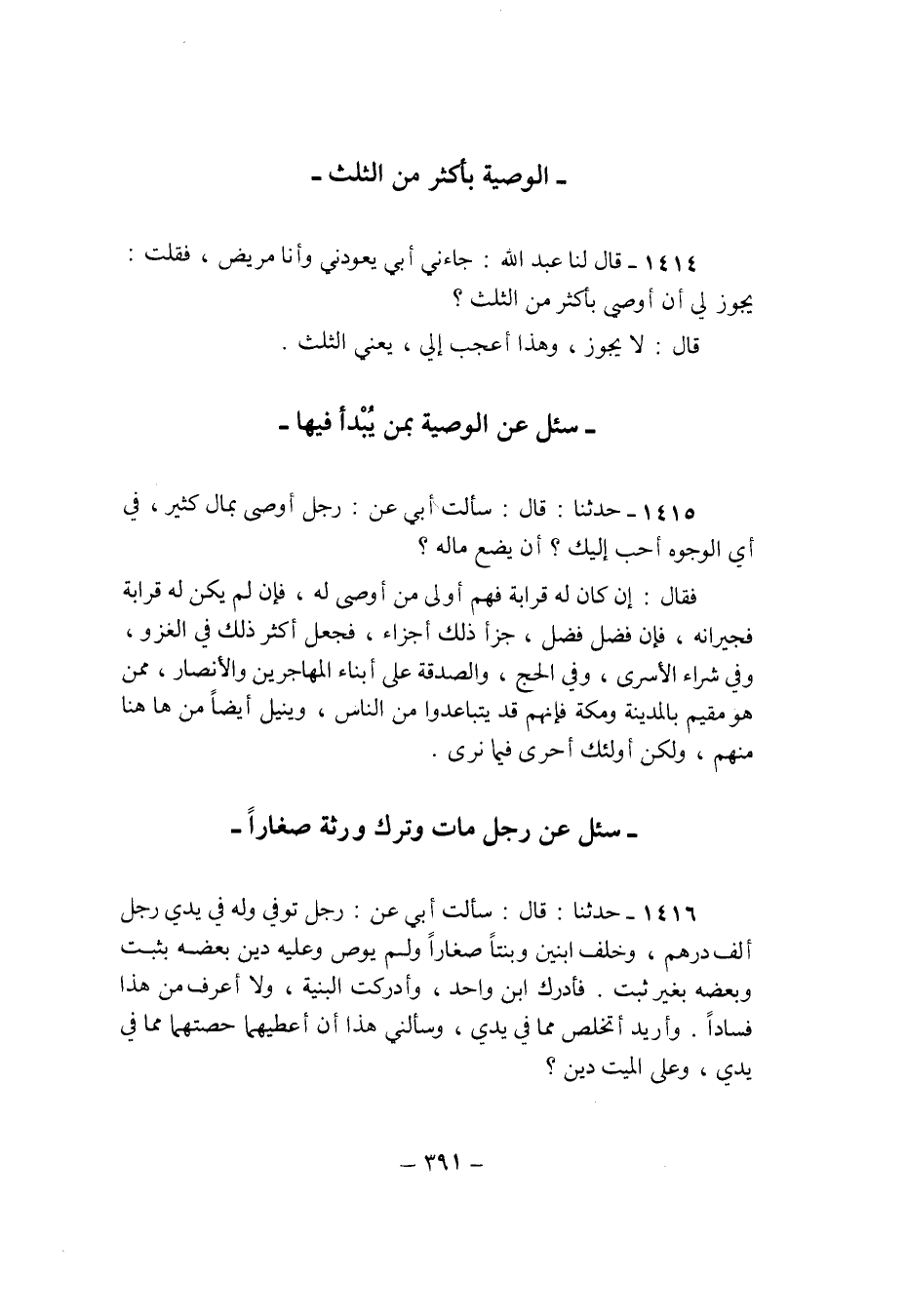 1415 - حَدثنَا قَالَ سَأَلت ابي عَن رجل اوصى بِمَال كثير فِي أَي الْوُجُوه احب اليك أَن يضع مَاله