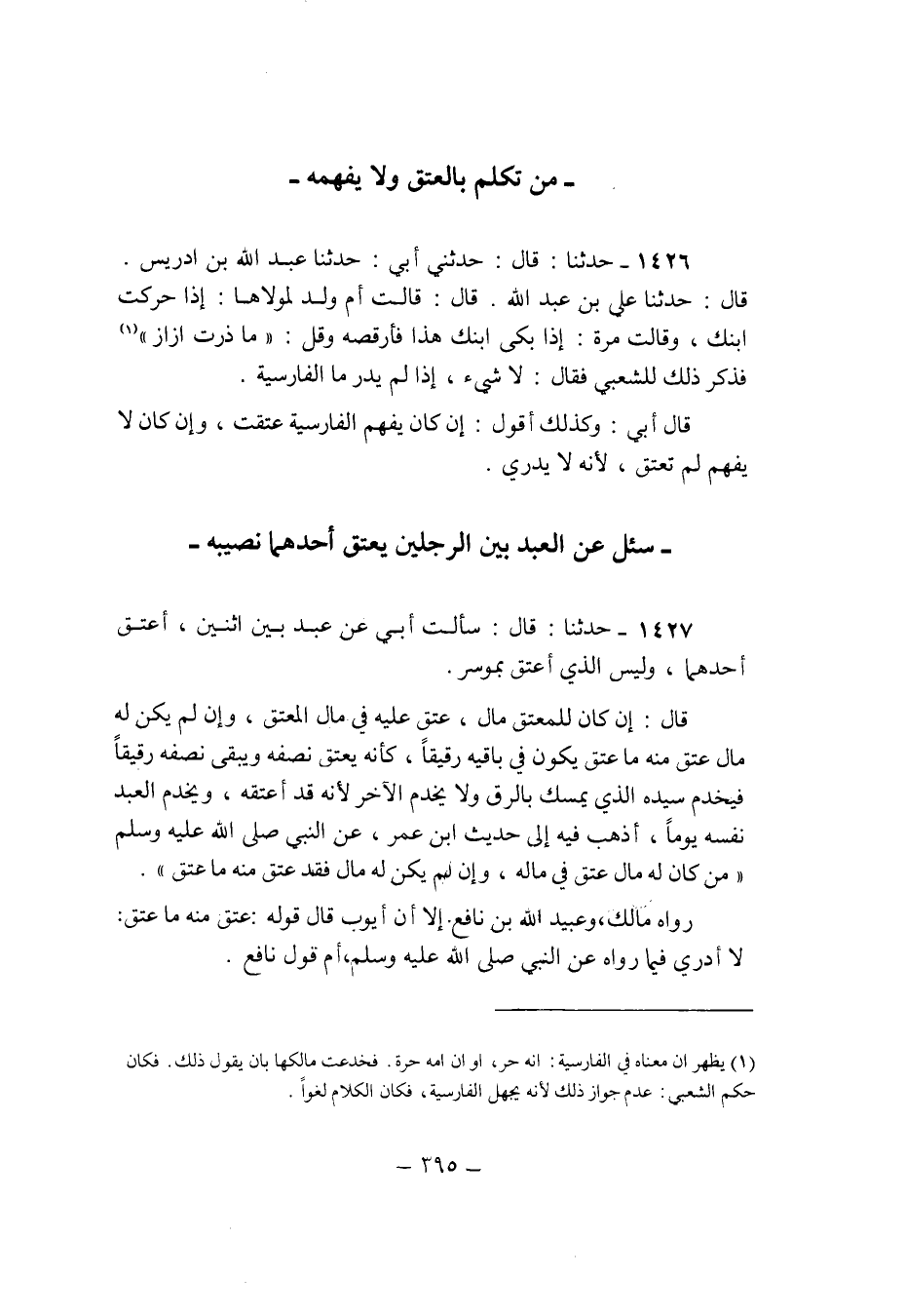 1426 - حَدثنَا قَالَ حَدثنِي ابي حَدثنَا عبد الله بن ادريس قَالَ حَدثنَا عَليّ بن عبد الله قَالَ قَالَت ام ولد لمولاها اذا حركت ابْنك وَقَالَت مرّة اذا بَكَى ابْنك هَذَا فأرقصه وَقل مَا ذرت ازاز فَذكر ذَلِك لِلشَّعْبِيِّ فَقَالَ لَا شَيْء اذا لم يدر مَا الفارسية
