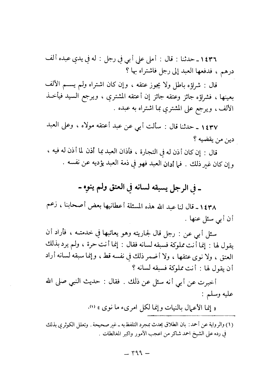 1438 - قَالَ لنا عبد الله هَذِه المسئلة اعطانيها بعض اصحابنا زعم ان ابي سُئِلَ عَنْهَا