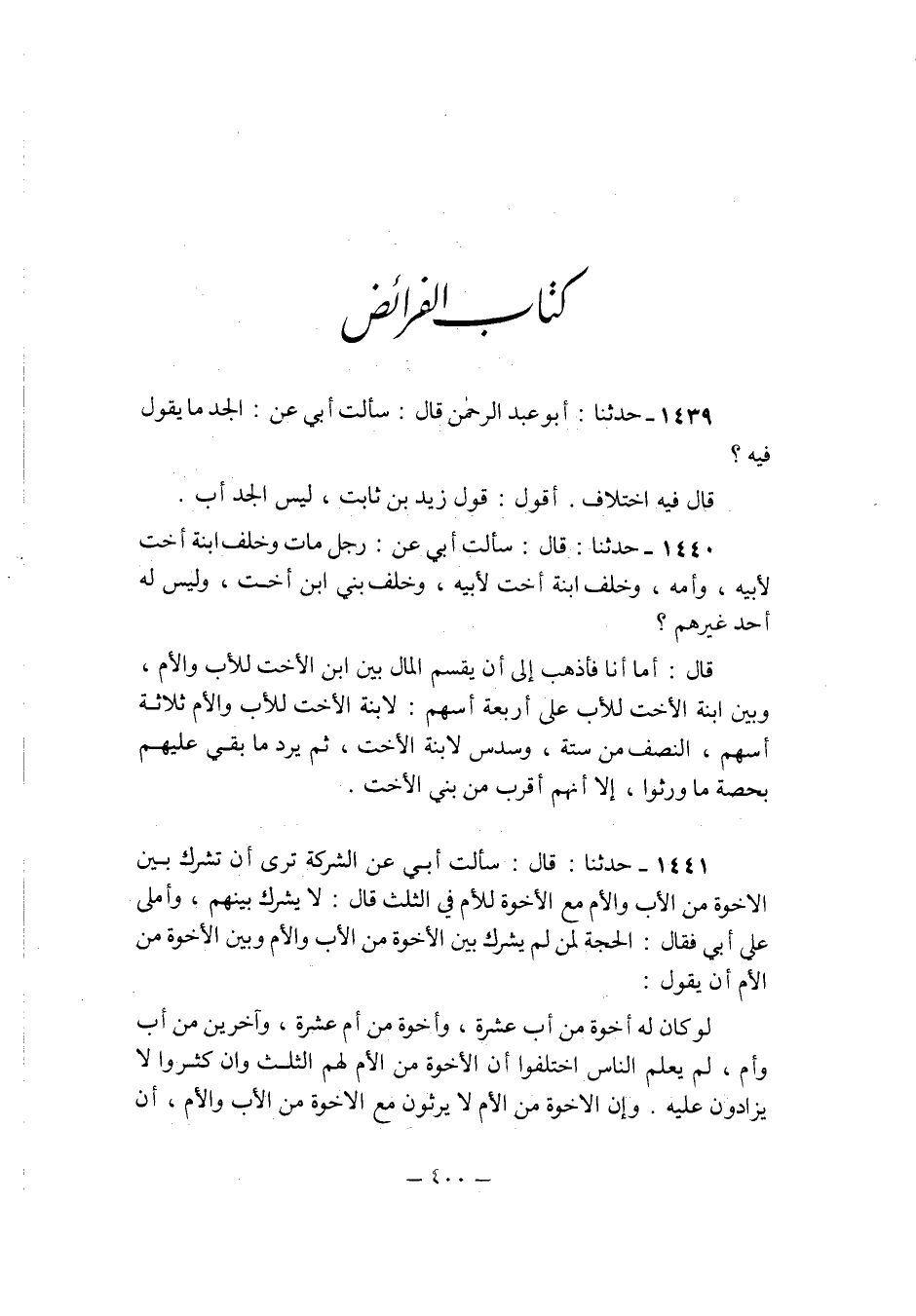 1441 - حَدثنَا قَالَ سَأَلت ابي عَن الشّركَة ترى ان تشرك بَين الاخوة من الاب والام مَعَ الاخوة للْأُم فِي الثُّلُث قَالَ لَا يُشْرك بَينهم واملي عَليّ ابي فَقَالَ الْحجَّة لمن لم يُشْرك بَين الاخوة من الاب والام وَبَين الاخوة من الام ان يَقُول