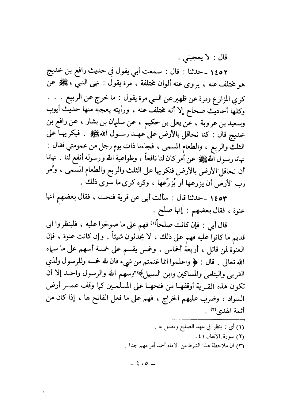 1452 - حَدثنَا قَالَ سَمِعت أبي يَقُول فِي حَدِيث رَافع بن خديج هُوَ مُخْتَلف عَنهُ يرْوى عَنهُ ألوان مُخْتَلفَة مرّة يَقُول نهى النَّبِي صلى الله عَلَيْهِ وَسلم عَن كري الْمزَارِع وَمرَّة عَن ظهير عَن النَّبِي مرّة يَقُول مَا خرج عَن الرّبيع وَكلهَا أَحَادِيث صِحَاح إِلَّا أَنه مُخْتَلف عَنهُ ورأيته يُعجبهُ مِنْهَا حَدِيث أَيُّوب وَسَعِيد بن عرُوبَة عَن يعلى بن حَكِيم عَن سُلَيْمَان بن بشار عَن رَافع بن خديج قَالَ كُنَّا نحاقل بِالْأَرْضِ على عهد الرَّسُول الله صلى الله عَلَيْهِ وَسلم فيكريها على الثُّلُث وَالرّبع وَالطَّعَام الْمُسَمّى فجاءنا ذَات يَوْم رجل من عمومتي فَقَالَ نَهَانَا رَسُول الله صلى الله عَلَيْهِ وَسلم عَن أَمر كَانَ لنا نَافِعًا وطواعية الله وَرَسُوله أَنْفَع لنا نَهَانَا أَن نحاقل الأَرْض بِالْأَرْضِ فنكريها على الثُّلُث وَالرّبع وَالطَّعَام الْمُسَمّى وَأمر رب الأَرْض أَن يَزْرَعهَا أَو يَزْرَعهَا وَكره كرى مَا سوى ذَلِك