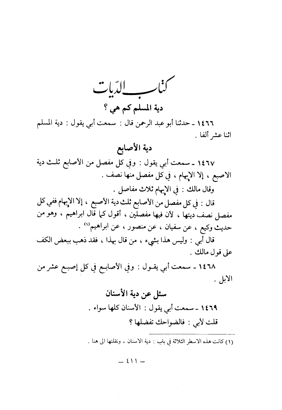 1467 - سَمِعت ابي يَقُول وَفِي كل مفصل من الاصابع ثلث دِيَة الاصبع الا الابهام فِي كل مفصل مِنْهَا نصف