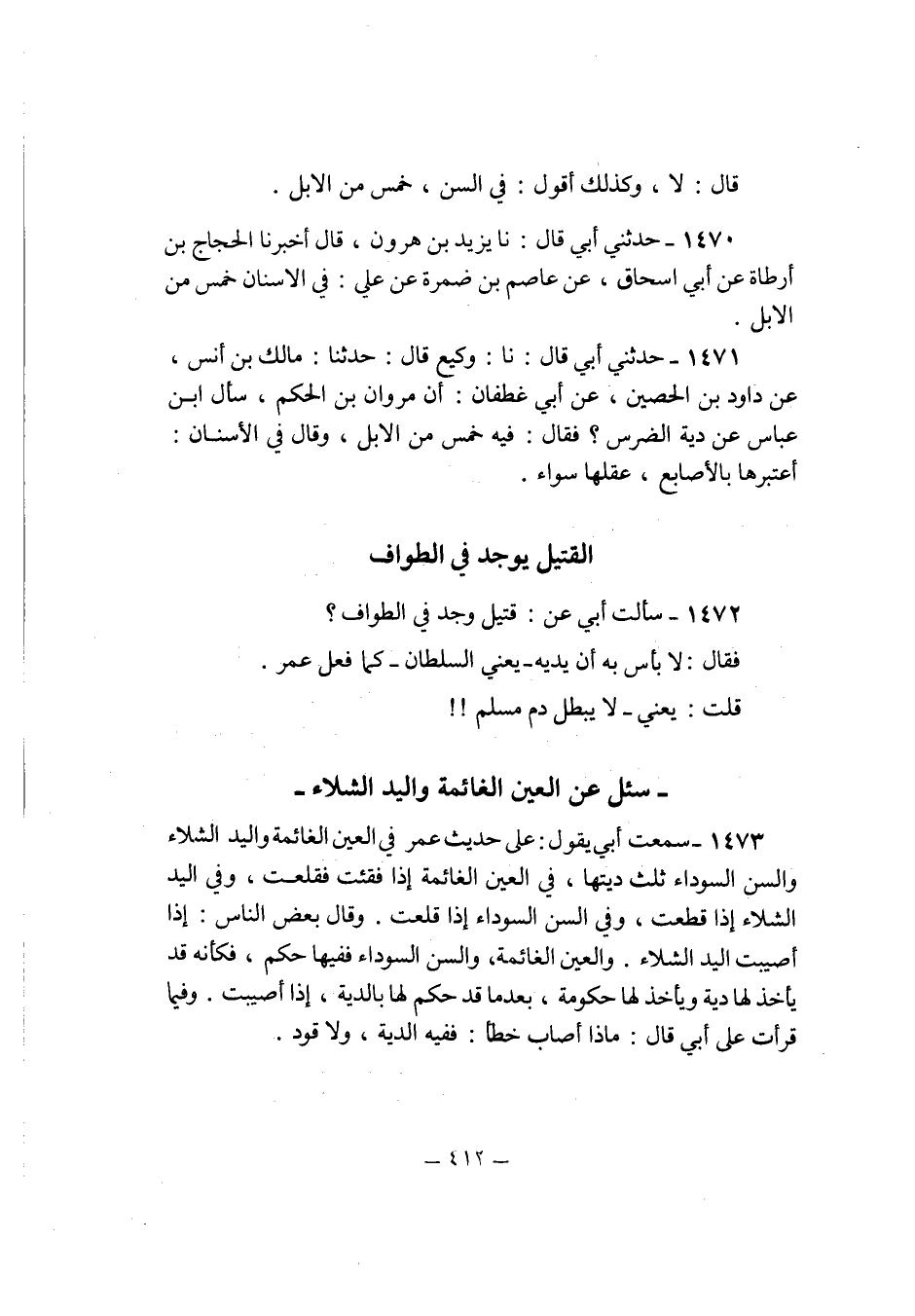 1473 - سَمِعت ابي يَقُول على حَدِيث عمر فِي الْعين الغائمة وَالْيَد الشلاء وَالسّن السَّوْدَاء ثلث دِيَتهَا فِي الْعين الغائمة اذا فقئت فَقلعت وَفِي الْيَد الشلاء اذا قطعت ووفي السن السَّوْدَاء إِذا قلعت وَقَالَ بعض النَّاس إِذا أُصِيبَت الْيَد الشلاء الْعين الغائمة وَالسّن السَّوْدَاء فَفِيهَا حكم فَكَأَنَّهُ قد يَأْخُذ لَهَا دِيَة وَيَأْخُذ لَهَا حُكُومَة بَعْدَمَا قد حكم لَهَا بِالدِّيَةِ اذا اصيبت وَفِيمَا قَرَأت على ابي قَالَ مَاذَا اصاب خطأ فَفِيهِ الدِّيَة وَلَا قَود