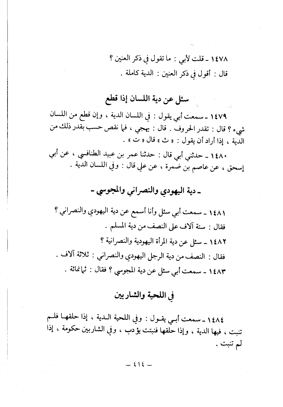 1479 - سَمِعت ابي يَقُول فِي اللِّسَان الدِّيَة وان قطع من اللِّسَان شَيْء قَالَ تقدر الْحُرُوف قَالَ يهجي فَمَا نقص حسب بِقدر ذَلِك من الدِّيَة اذا اراد ان يَقُول ث قَالَ ت