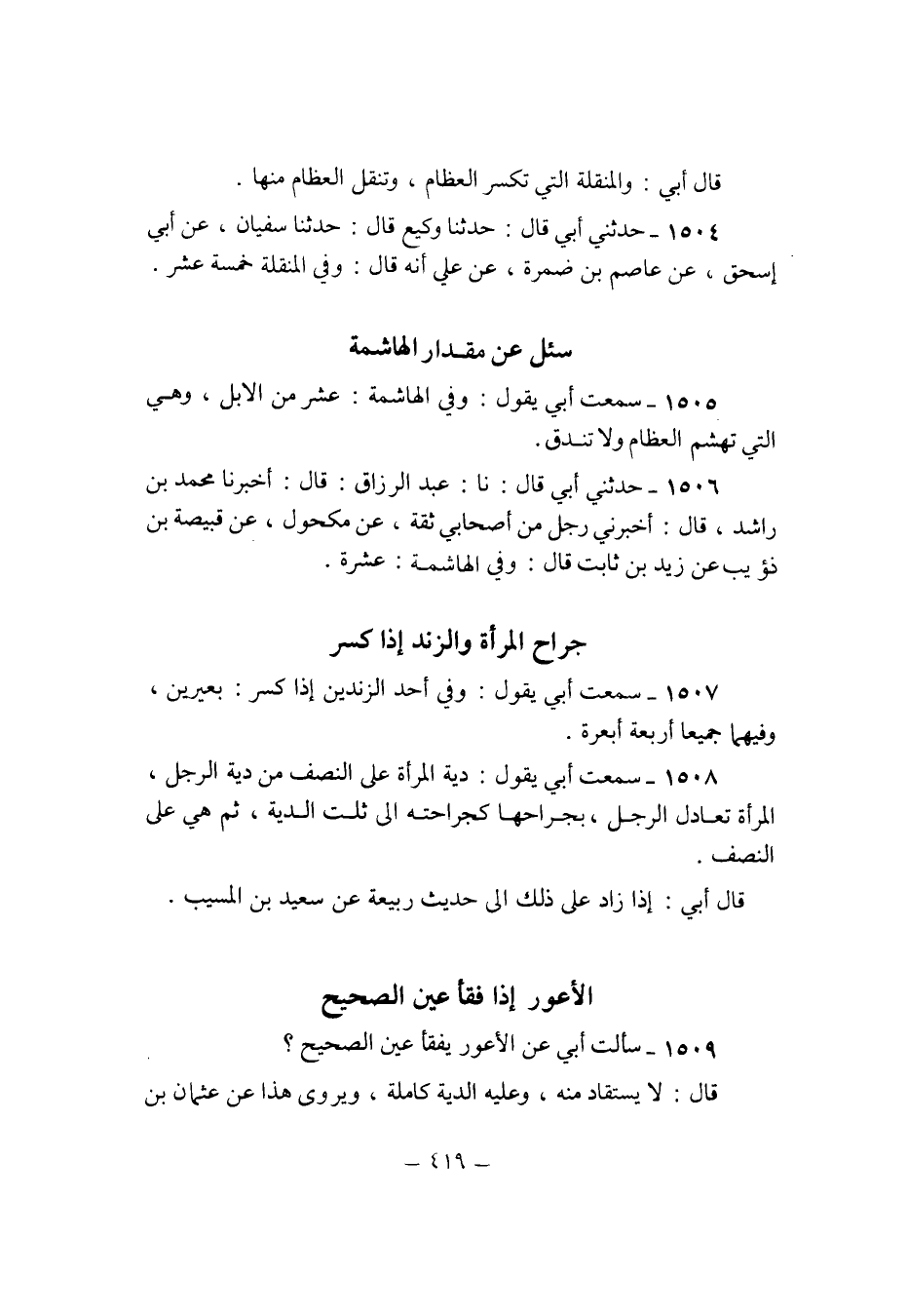 1507 - سَمِعت ابي يَقُول وَفِي اُحْدُ الزندين اذا كسر بَعِيرَيْنِ وَفِيهِمَا جَمِيعًا اربعة ابعرة