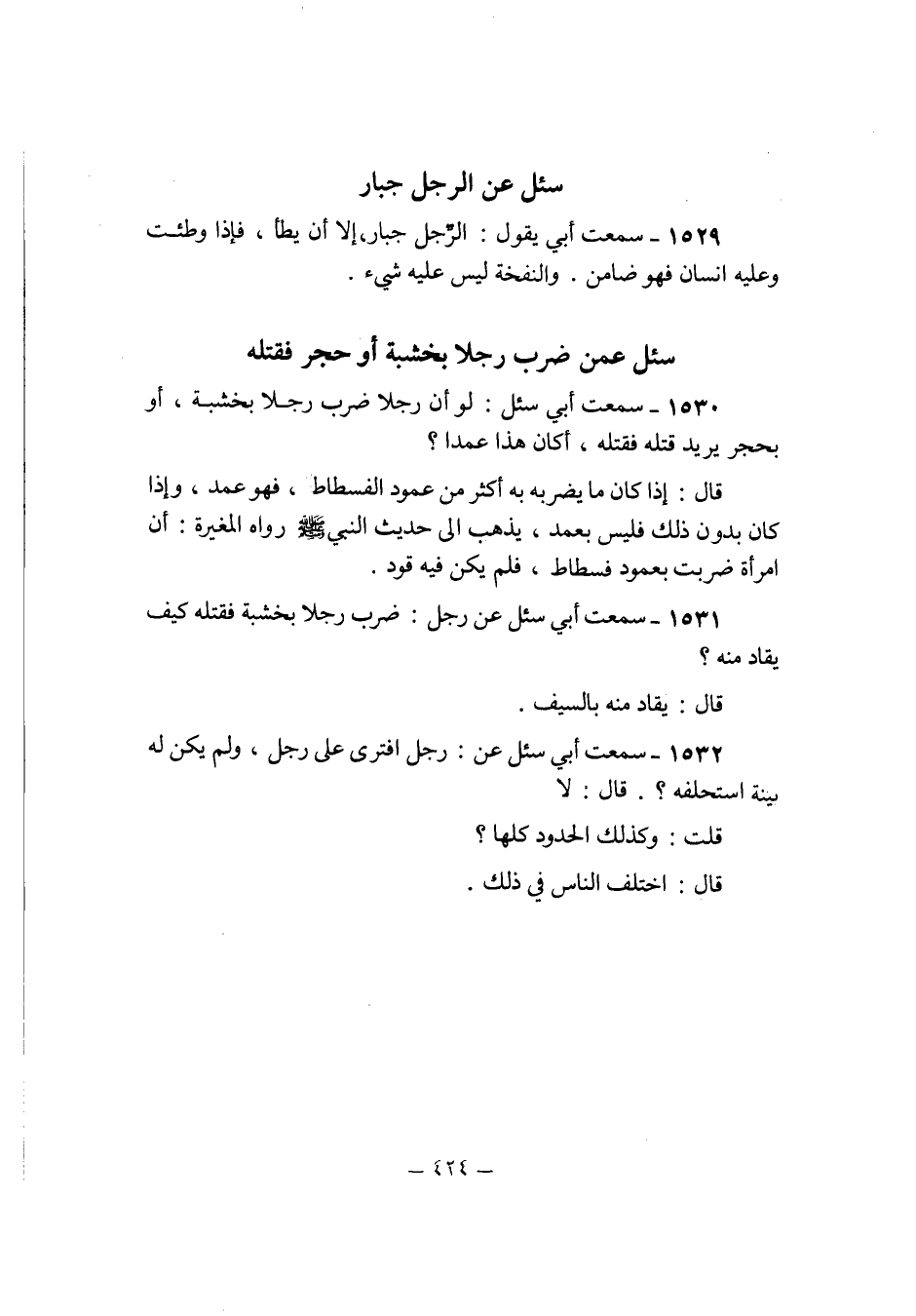 1530 - سَمِعت ابي سُئِلَ لَو ان رجلا ضرب رجلا بخشبة اَوْ بِحجر يُرِيد قَتله فَقتله أَكَانَ هَذَا عمدا