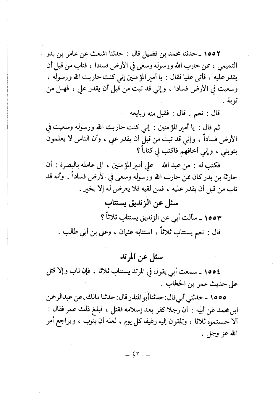 1552 - حَدثنَا مُحَمَّد بن فُضَيْل قَالَ حَدثنَا اشعث عَن عَامل بن بدر التَّمِيمِي مِمَّن حَارب الله وَرَسُوله وسعى فِي الارض فَسَادًا فَتَابَ من قبل ان يقدر عَلَيْهِ فَأتى عليا فَقَالَ يَا امير الْمُؤمنِينَ اني كنت حَارَبت الله وَرَسُوله وسعيت فِي الارض فَسَادًا واني قد تبت من قبل ان يقدر عَليّ فَهَل من تَوْبَة