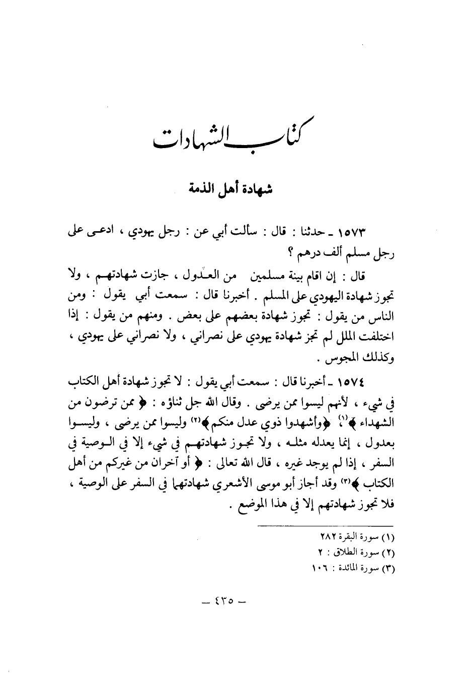 1574 - اُخْبُرْنَا قَالَ سَمِعت أبي يَقُول لَا تجوز شَهَادَة اهل الْكتاب فِي شَيْء لأَنهم لَيْسُوا مِمَّن يرضى وَقَالَ الله جلّ ثَنَاؤُهُ {مِمَّن ترْضونَ من الشُّهَدَاء} {وَأشْهدُوا ذَوي عدل مِنْكُم} وَلَيْسوا مِمَّن يرضى وَلَيْسوا بعدول انما يعدله مثله وَلَا تجوز شهاداتهم فِي شَيْء الا فِي الْوَصِيَّة فِي السّفر اذا لم يُوجد غَيره قَالَ الله تَعَالَى {أَو آخرَانِ من غَيْركُمْ} من اهل الْكتاب وَقد اجاز ابو مُوسَى الاشعري شَهَادَتهمَا فِي السّفر على الْوَصِيَّة فَلَا تجوز شهاداتهم الا فِي هَذَا الْموضع