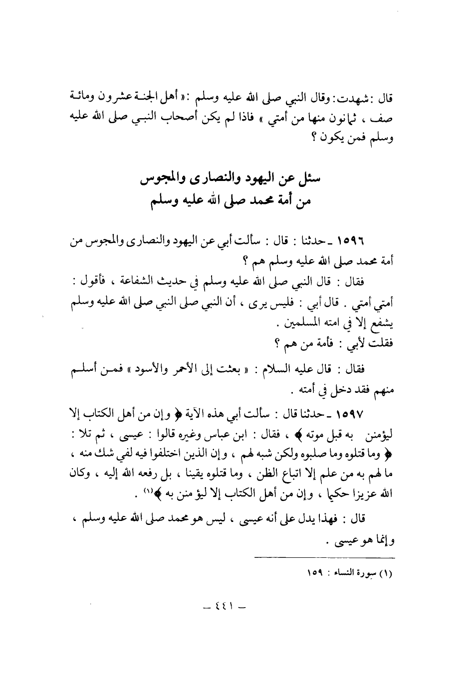 1596 - حَدثنَا قَالَ سَأَلت ابي عَن الْيَهُود وَالنَّصَارَى وَالْمَجُوس من امة مُحَمَّد صلى الله عَلَيْهِ وَسلم هم
