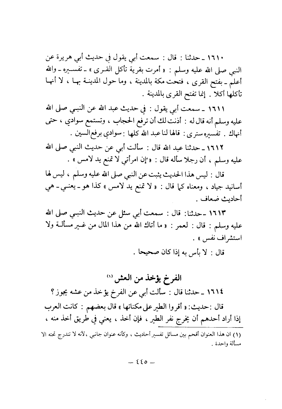 1612 - حَدثنَا عبد الله قَالَ سَأَلت ابي عَن حَدِيث النَّبِي صلى الله عَلَيْهِ وَسلم ان رجلا سَأَلَهُ قَالَ ان امْرَأَتي لَا تمنع يَد لَا مس