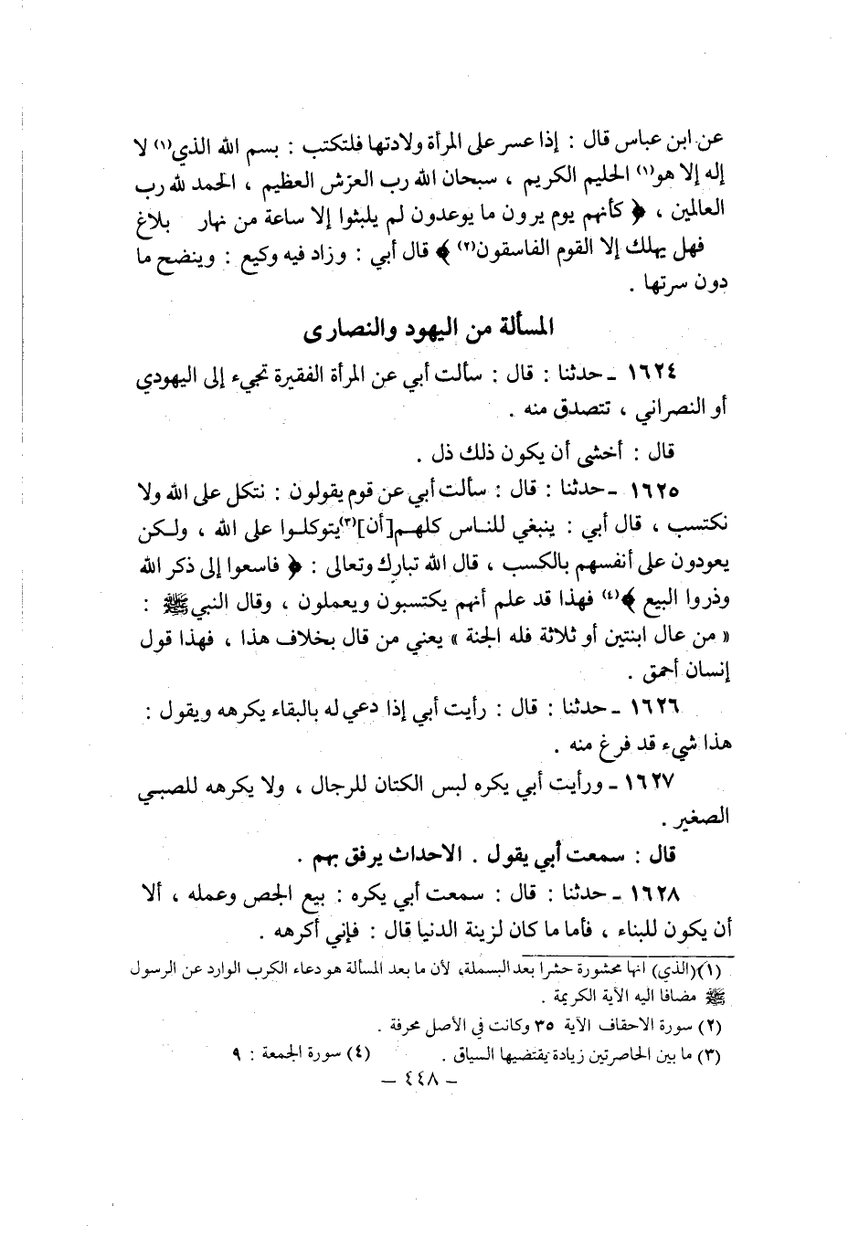 1625 - حَدثنَا قَالَ سَأَلت ابي عَن قوم يَقُولُونَ نَتَّكِل على الله وَلَا نكتسب قَالَ ابي يَنْبَغِي للنَّاس كلهم أَن يتوكلوا على الله وَلَكِن يعودون على انفسهم بِالْكَسْبِ قَالَ الله تبَارك وَتَعَالَى {فَاسْعَوْا إِلَى ذكر الله وذروا البيع} فَهَذَا قد علم انهم يكتسبون ويعملون وَقَالَ النَّبِي صلى الله عَلَيْهِ وَسلم من عَال ابْنَتَيْن اَوْ ثَلَاثَة فَلهُ الْجنَّة يَعْنِي من قَالَ بِخِلَاف هَذَا فَهَذَا قَول انسان احمق